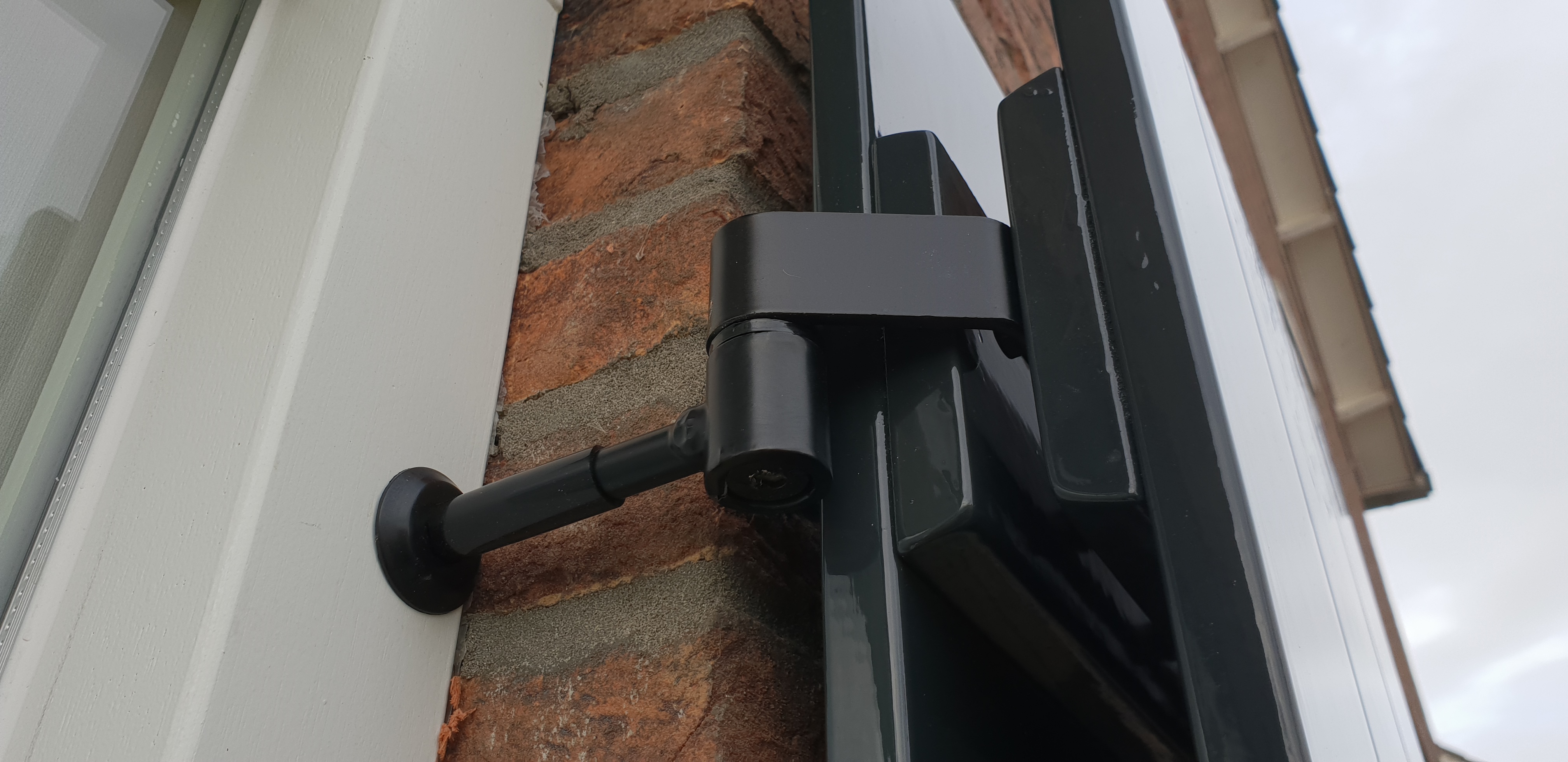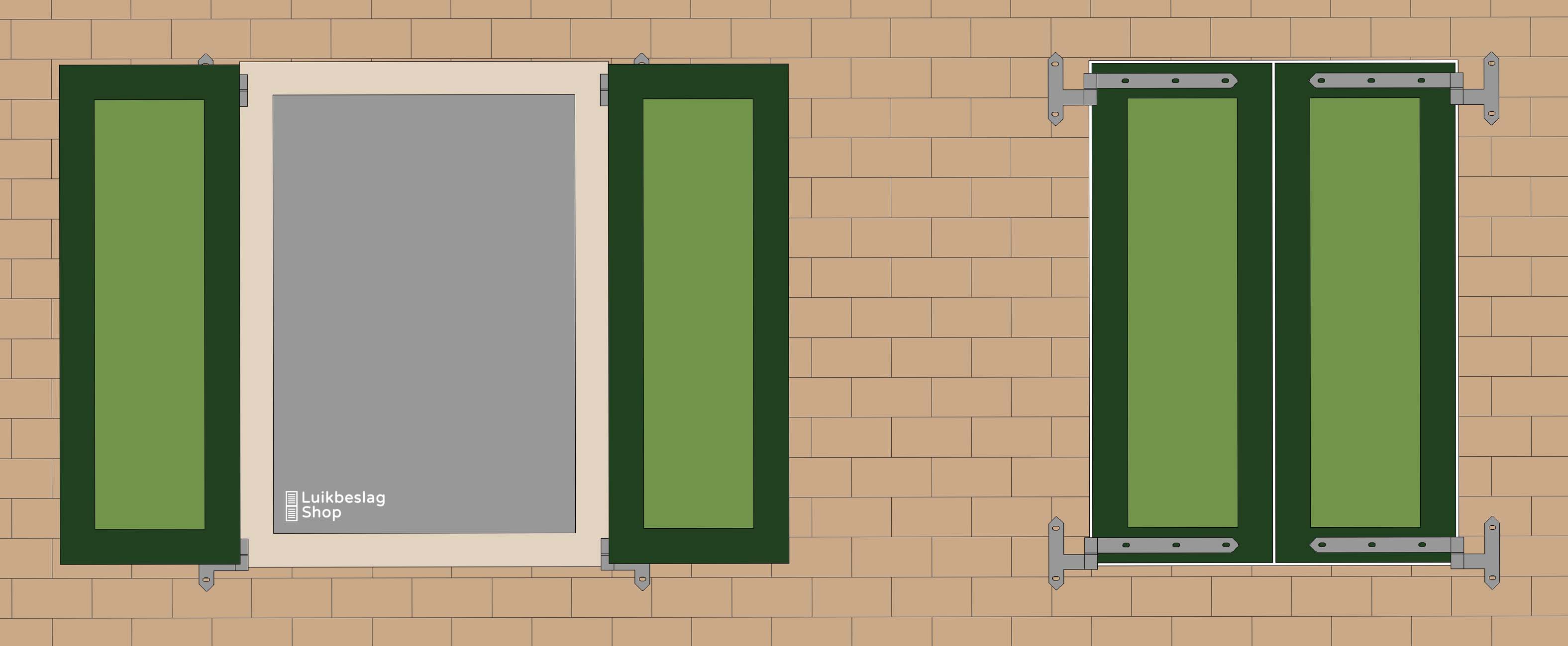 Staarthengen op kader luiken. Staarthengen kunnen op luiken met een kader maar dan moet u met het volgende rekening houden: Als de kaderhoogte kleiner is dan ca 120mm dan zijn bij muurmontage de plaatduimen boven en onder het kozijn zichtbaar als de luiken open zijn. Bij kozijnmontage komen de schroefduimen ver op de onder- of bovenkant van het kozijn, soms zelfs in de verbinding van de kozijnen. Hieronder een afbeelding om e.e.a. duidelijk te maken.