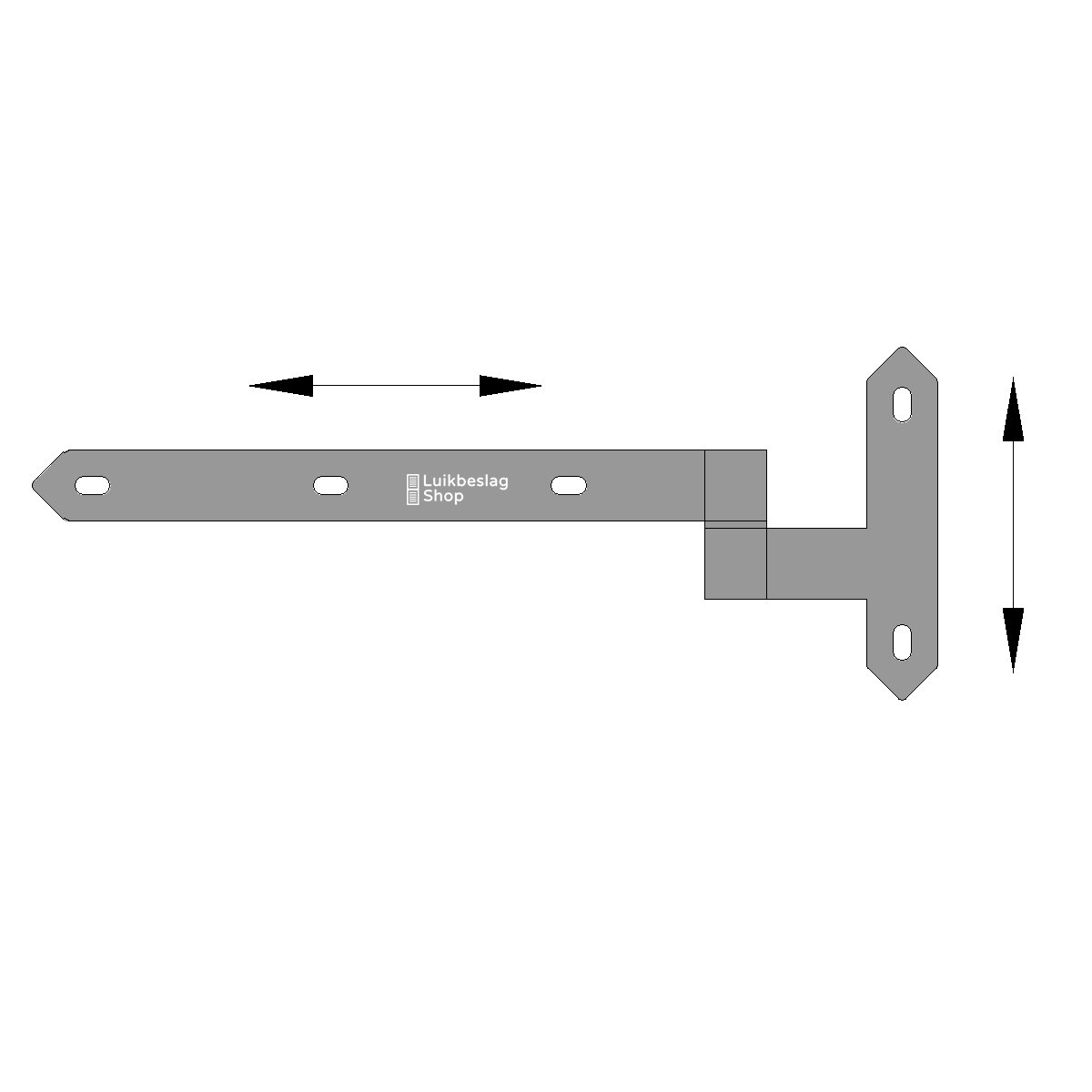 Verstelbaar luikbeslag. Door de vorm van de gaten zijn de hengen zijn verstelbaar. De T hengen en hoekhengen zijn verticaal verstelbaar en de staarthengen zijn horizontaal verstelbaar.