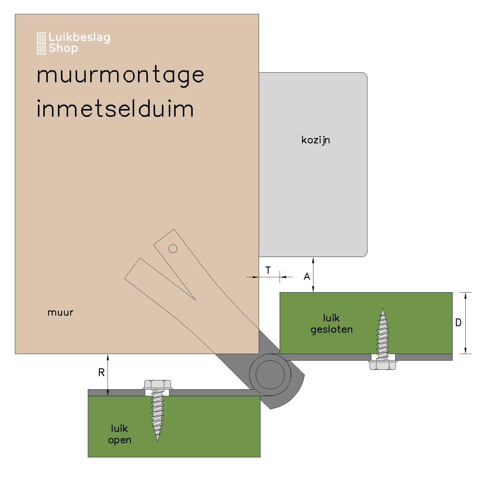 De inschroefduim moet ver genoeg van de muurkant worden geplaatst om uitbreken van de muur te voorkomen en kan worden geplaatst met een plug of met een chemisch anker. Anders dan muurmontage met een plaatduim is er een strook muur te zien als de luiken open zijn. Het luik zal in gesloten stand niet geheel vlak met de muur liggen. Nadeel van muurmontage met inschroefduim is dat het heng kan beschadigen als het luik gesloten wordt. Het is mogelijk met maatwerk hengen dit te voorkomen. Vraag naar de mogelijkheden. Om het doorzwaaien van de luiken te voorkomen, kunt u een aanloopsteuntje plaatsen.