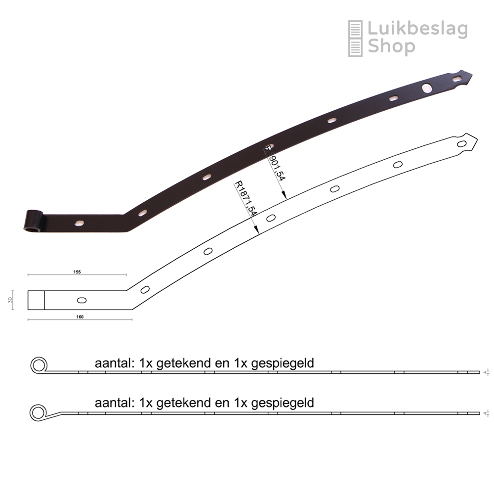 Hengen voor getoogde luiken: Is de bovenkant van uw luik getoogd (rond) dan kunnen wij hiervoor ook de hengen maken. U geeft ons een mal of een straal van de toog door en wij maken een productietekening.