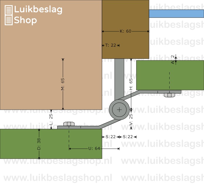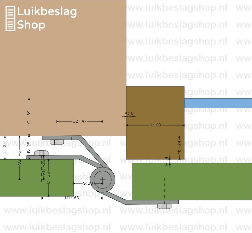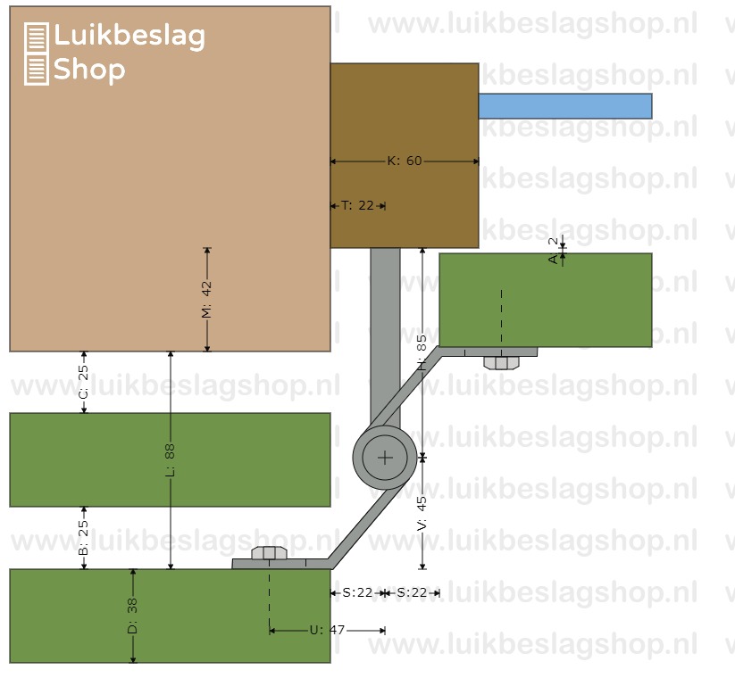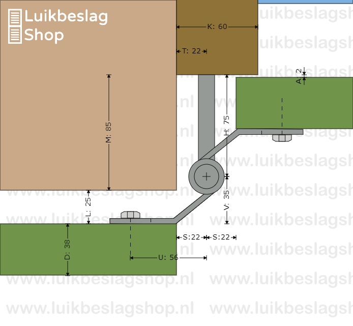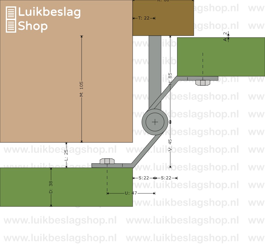 Standaard verzet 45mm, muurmontage plaatduim vouw- of overlappend luik, muurmontage. Heeft u andere maten, bijvoorbeeld de luikdikte? Hier kunt u de maten aanpassen in de draaipunttekening.