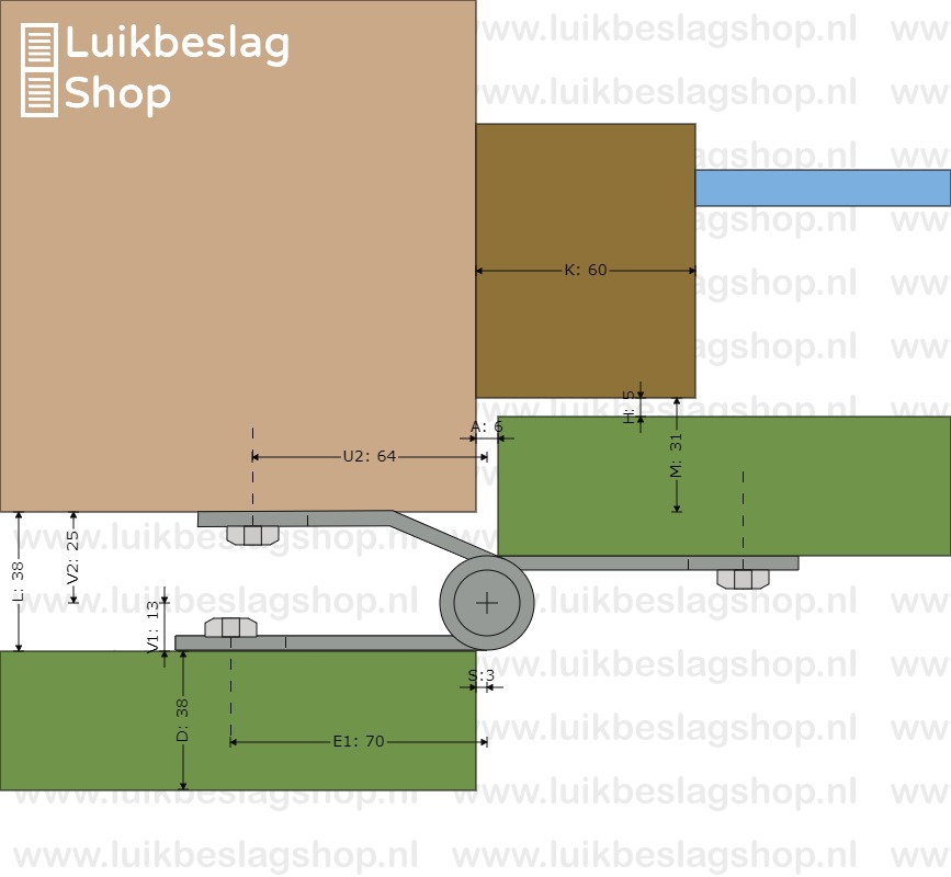 Standaard plaatduim verzet 25mm met heng recht (13mm), muurmontage. Heeft u andere maten, bijvoorbeeld de luikdikte? Hier kunt u de maten aanpassen in de draaipunttekening.