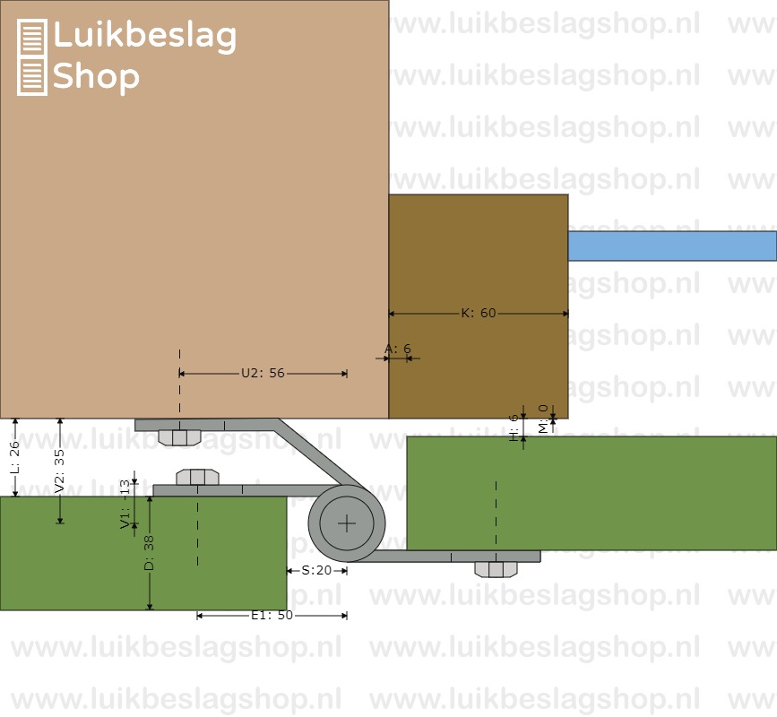 Standaard heng verzet 35mm, kozijnmontage. Heeft u andere maten, bijvoorbeeld de luikdikte? Hier kunt u de maten aanpassen in de draaipunttekening.