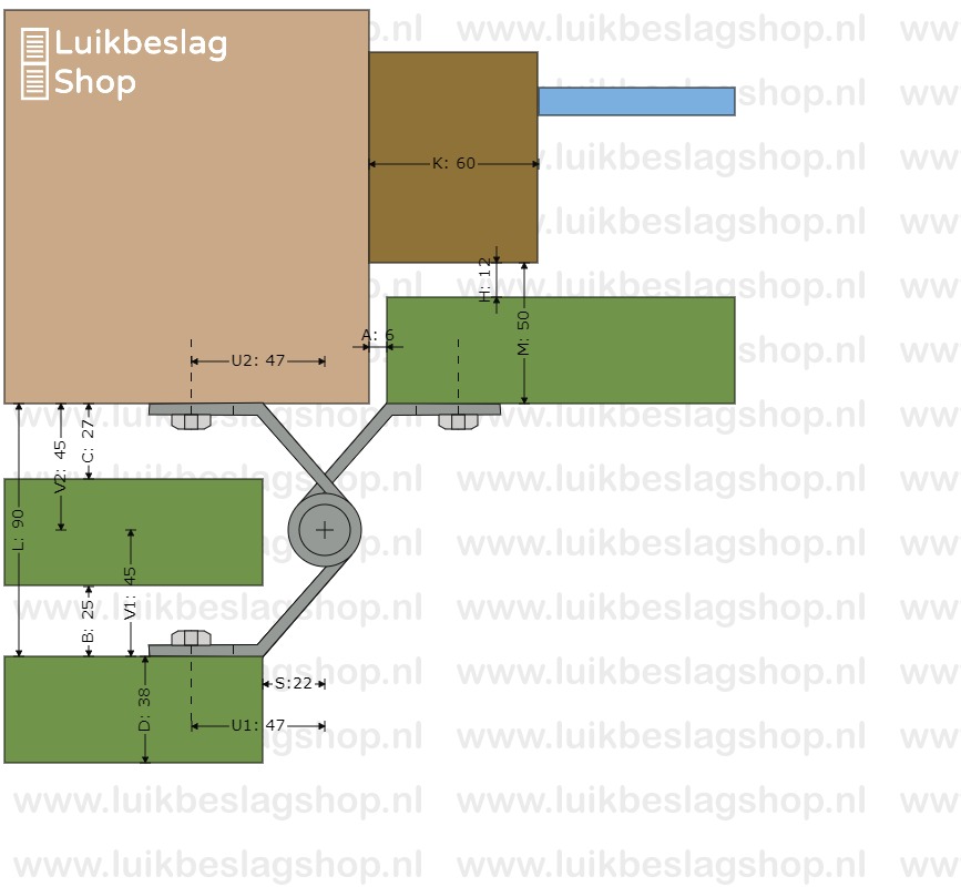 Standaard heng verzet 45mm, kozijnmontage vouw- of overlappend luik. Heeft u andere maten, bijvoorbeeld de luikdikte? Hier kunt u de maten aanpassen in de draaipunttekening.