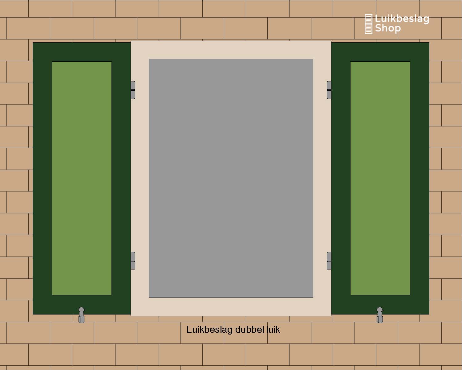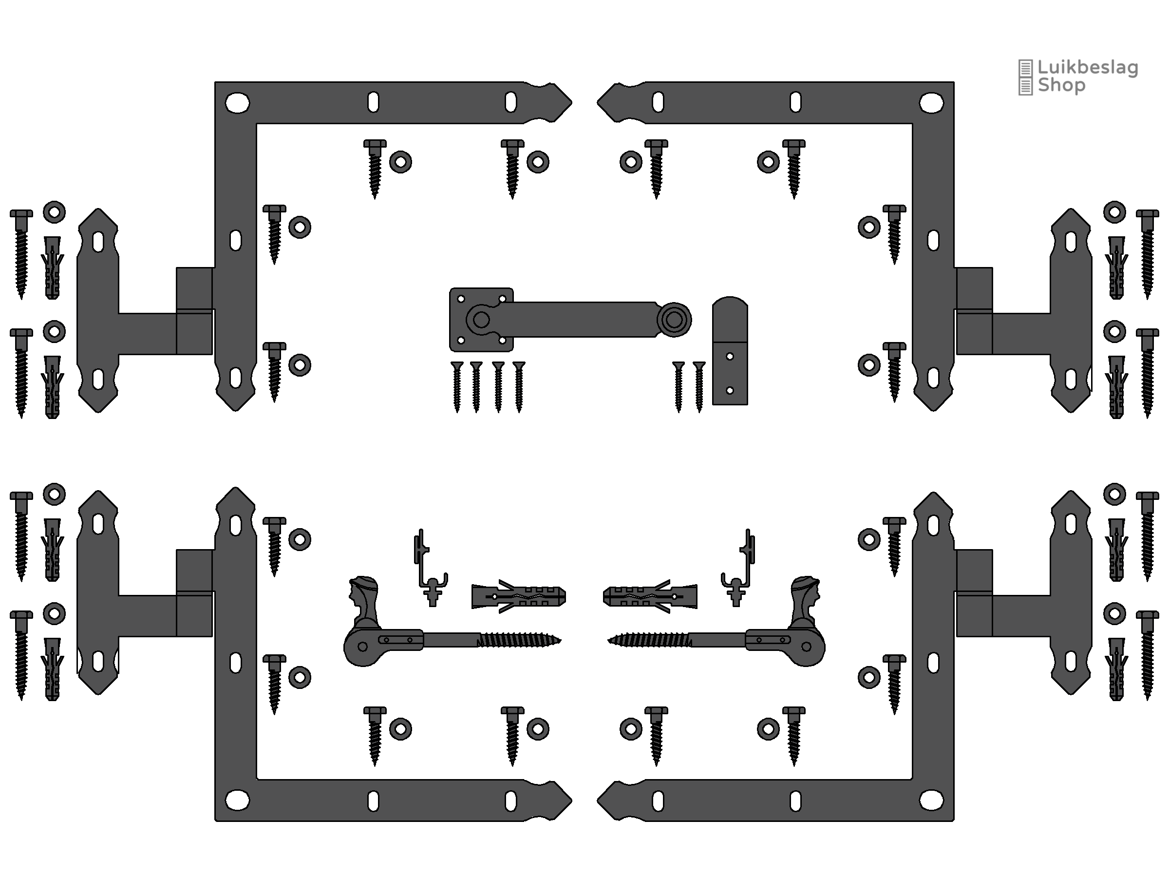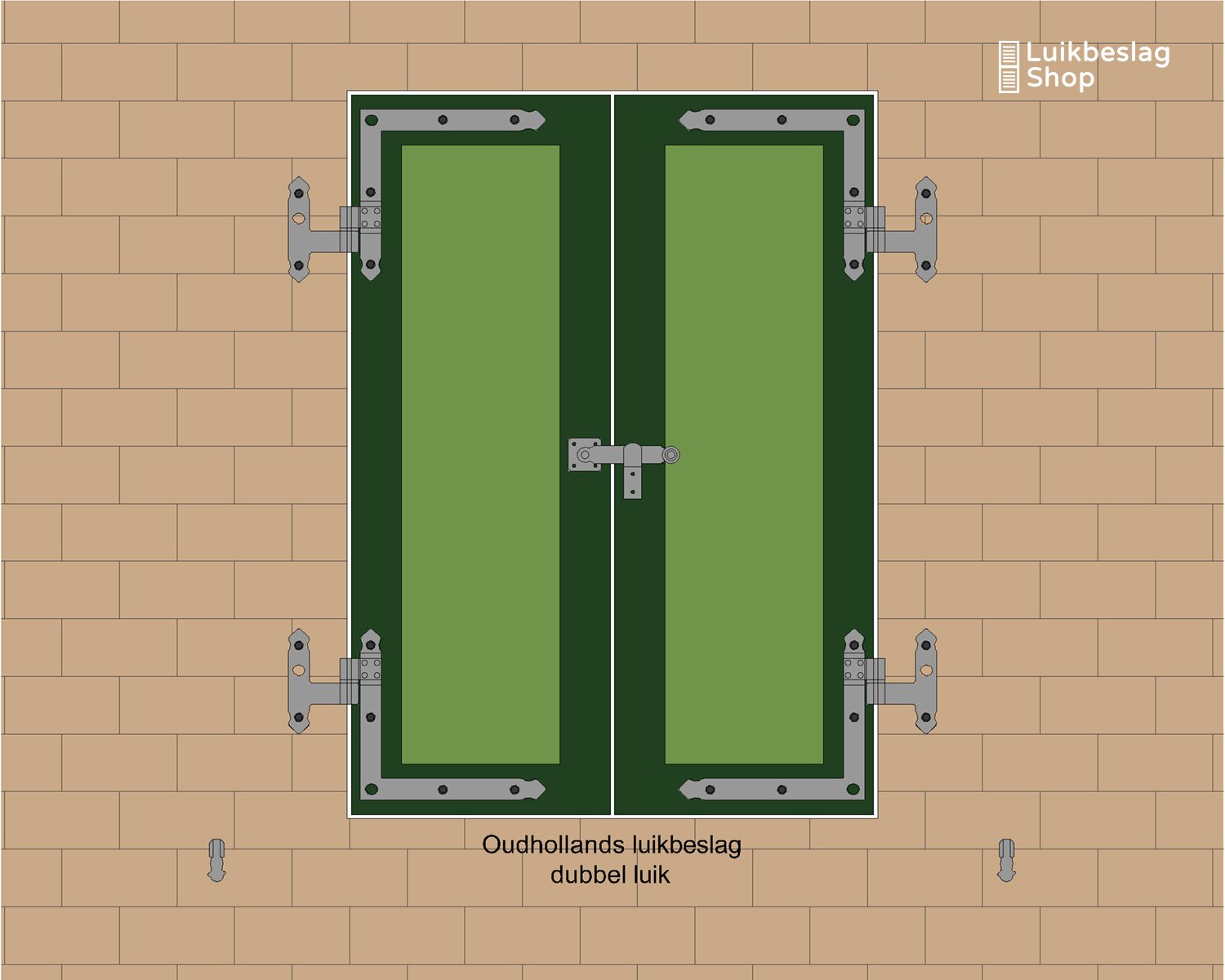 Complete set Oudhollands luikbeslag voor dubbel luik. Muurmontage met plaatduimen en hoekgeheng op het luik