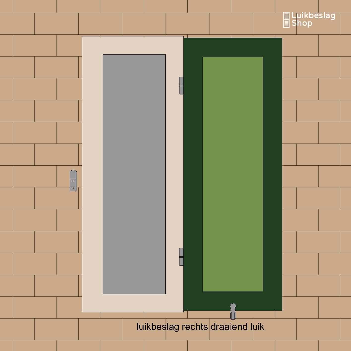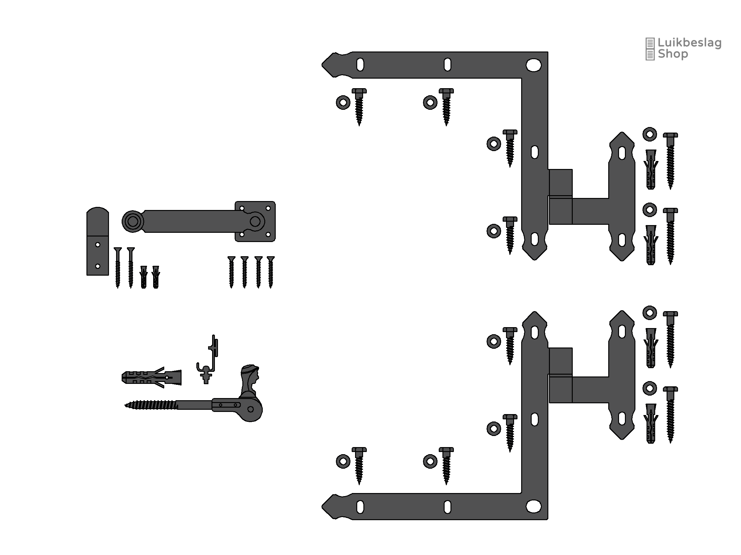 Complete set traditioneel luikbeslag voor 1 luik rechtsdraaiend. Muurmontage met plaatduimen en T hengen op het luik.