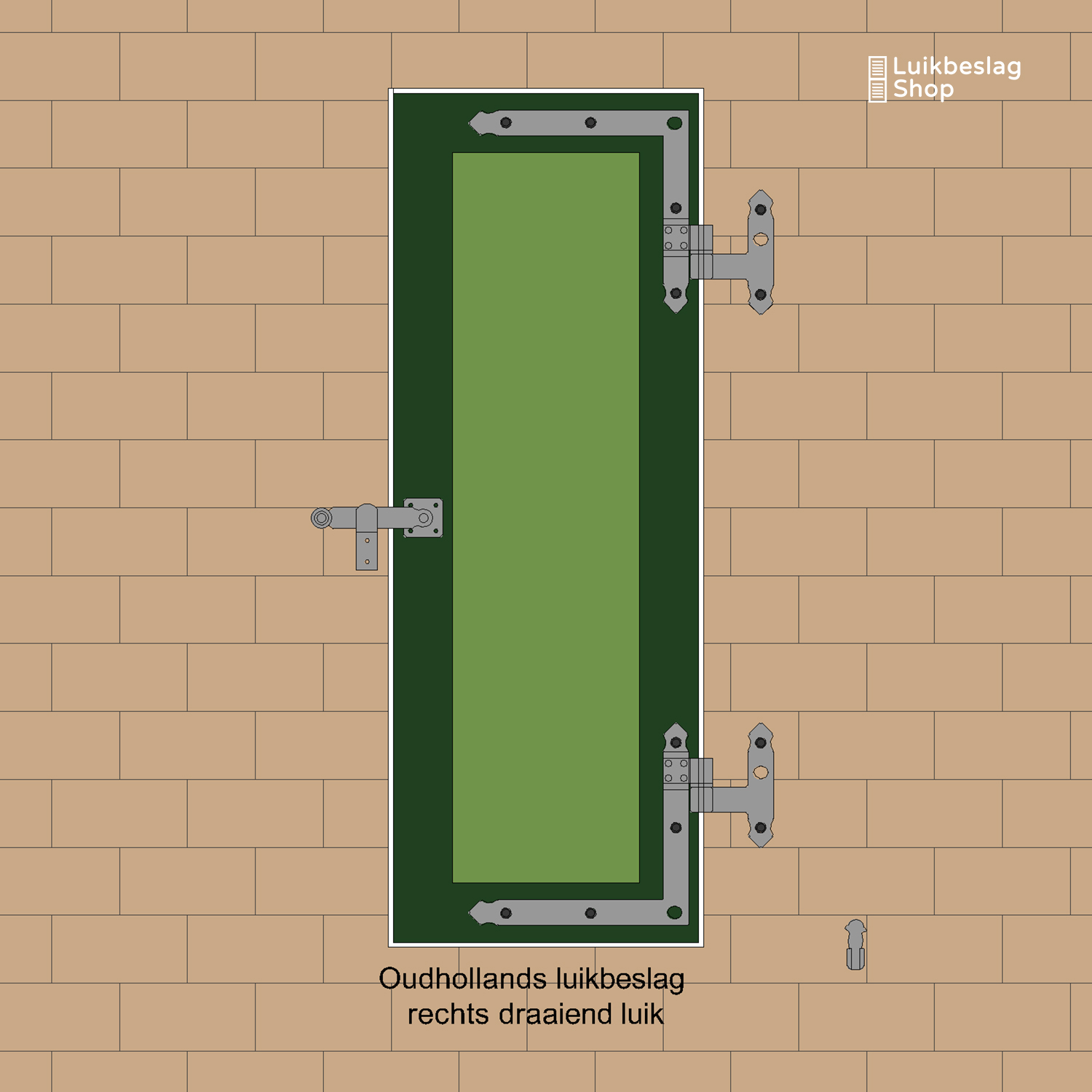 Complete set Oudhollands luikbeslag voor 1 luik rechtsdraaiend. Muurmontage met plaatduimen en T hengen op het luik.