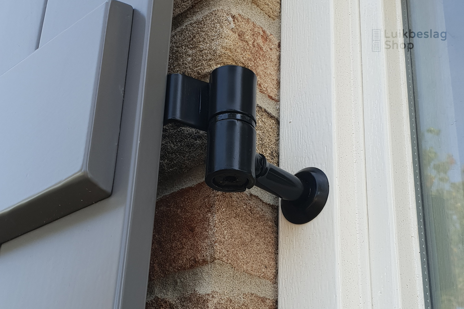 Complete set Oudhollands luikbeslag voor dubbel luik. Muurmontage met plaatduimen en hoekgeheng op het luik