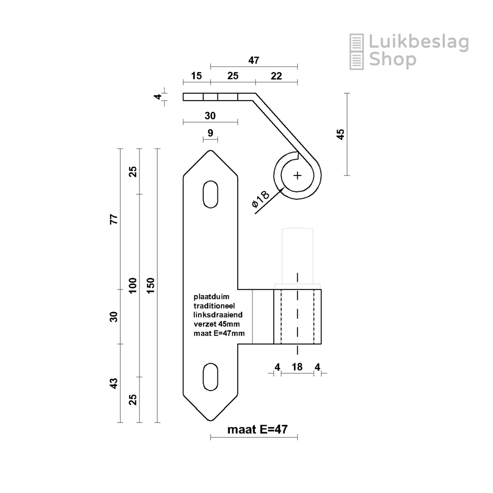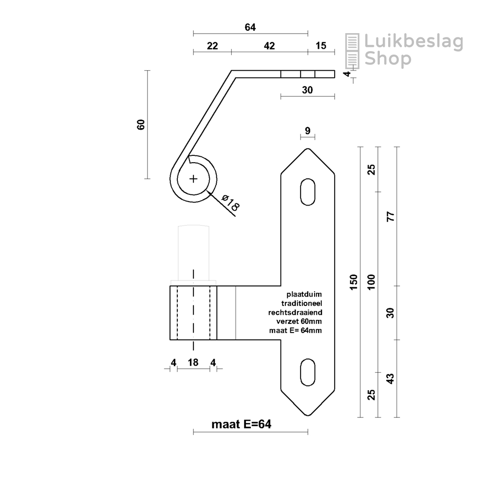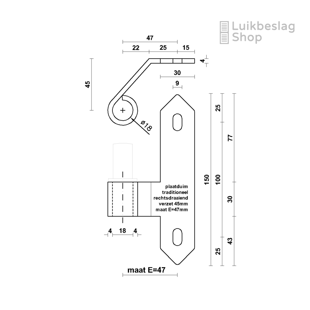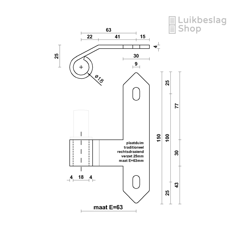 De traditionele plaatduim is te gebruiken voor muurmontage en dient gecombineerd te worden met de kunststof duimstift artikel 00-02-01.