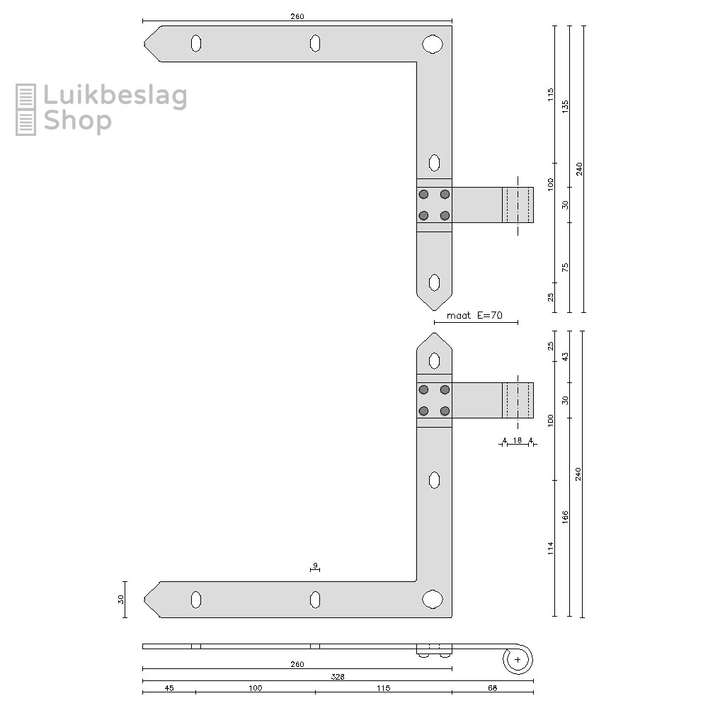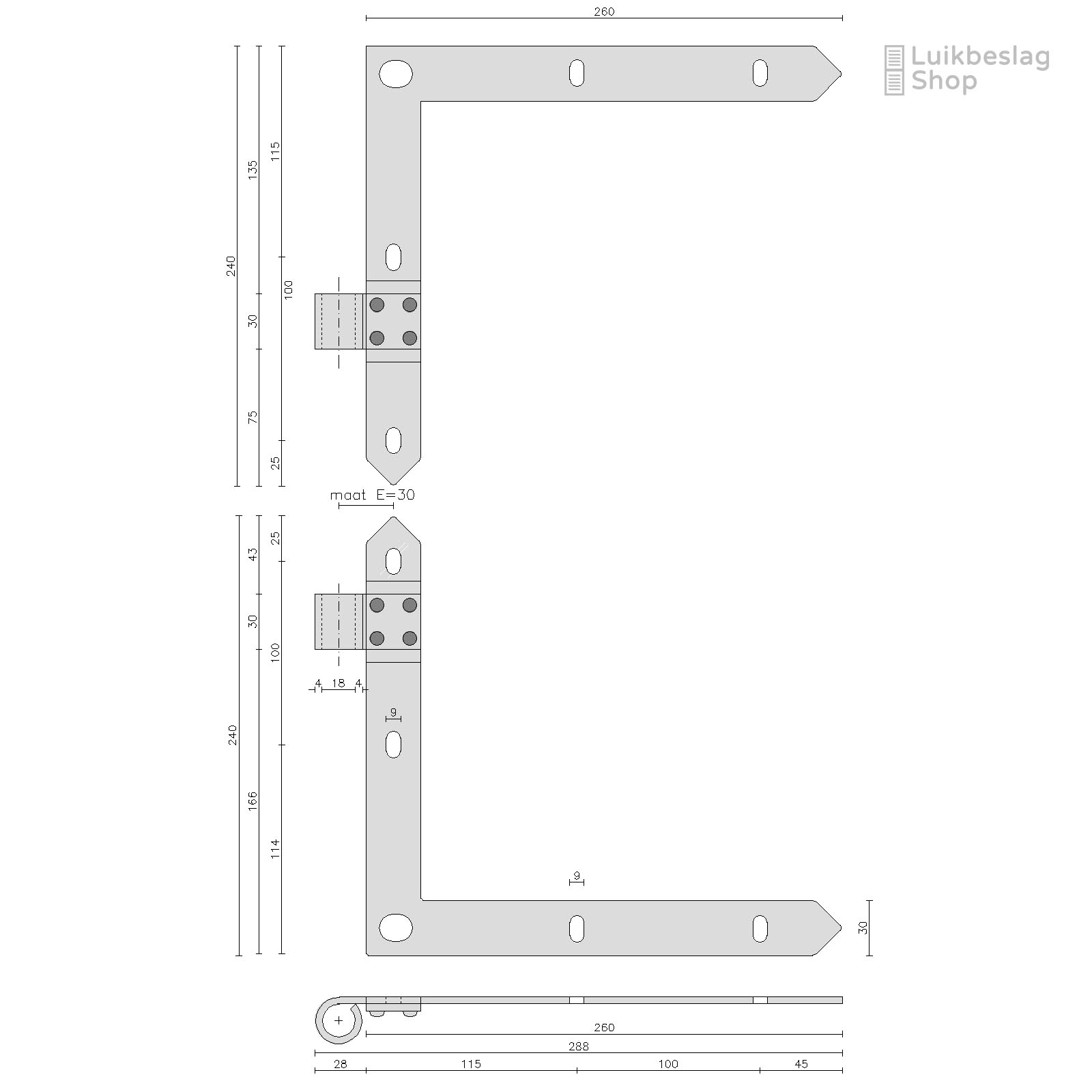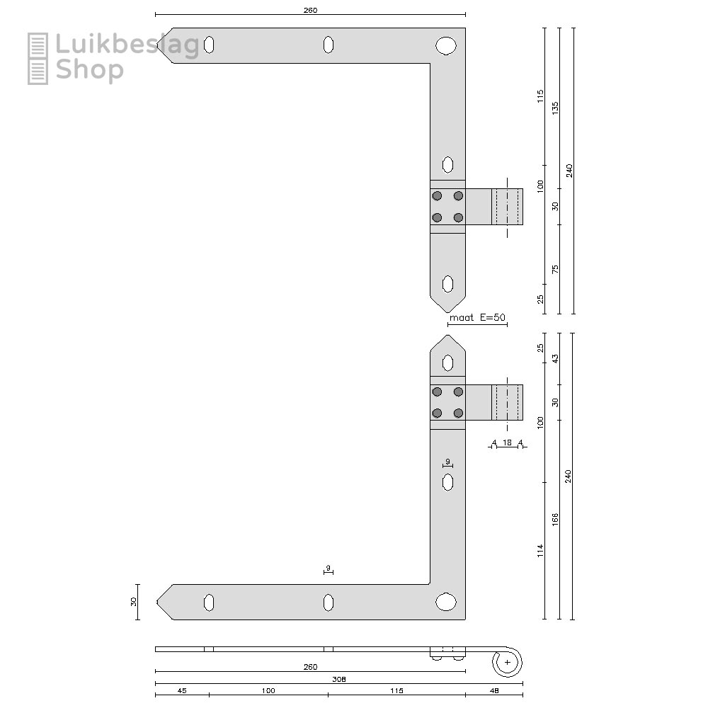 De montagegaten zijn 9mm. Er kunnen M8 houtdraadbouten of slotbouten worden gebruikt om de hengen te monteren.