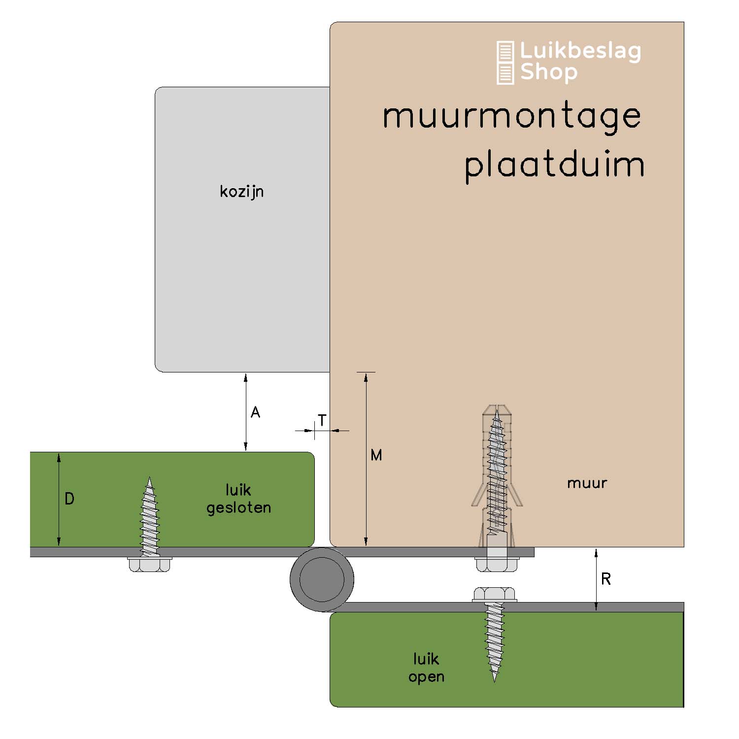 Bij muurmontage draait het luik in de meeste gevallen niet tegen het kozijn. De luikdikte (maat D) mag niet groter zijn dan de maat van voorkant kozijn tot voorkant muur (maat M)