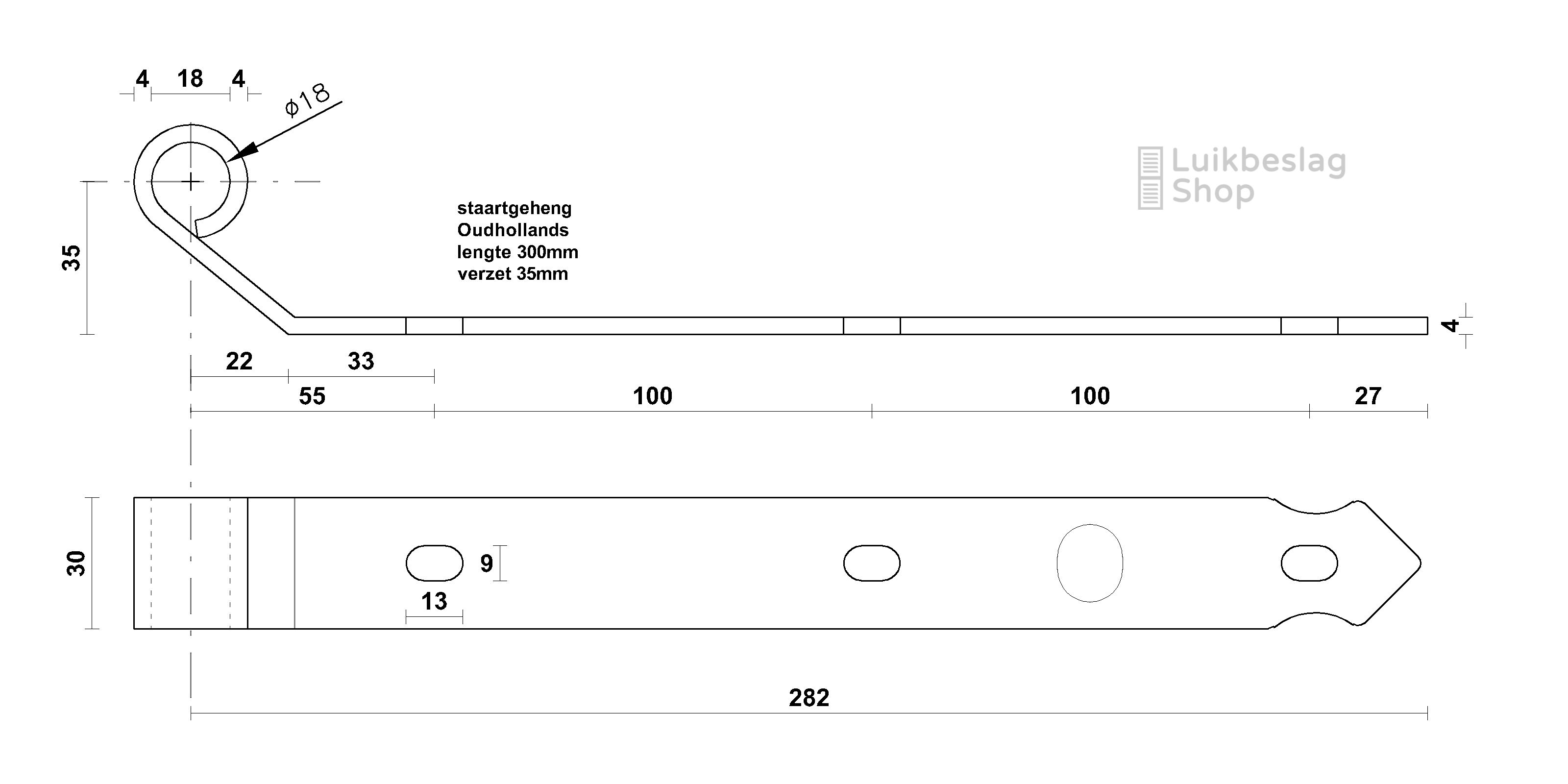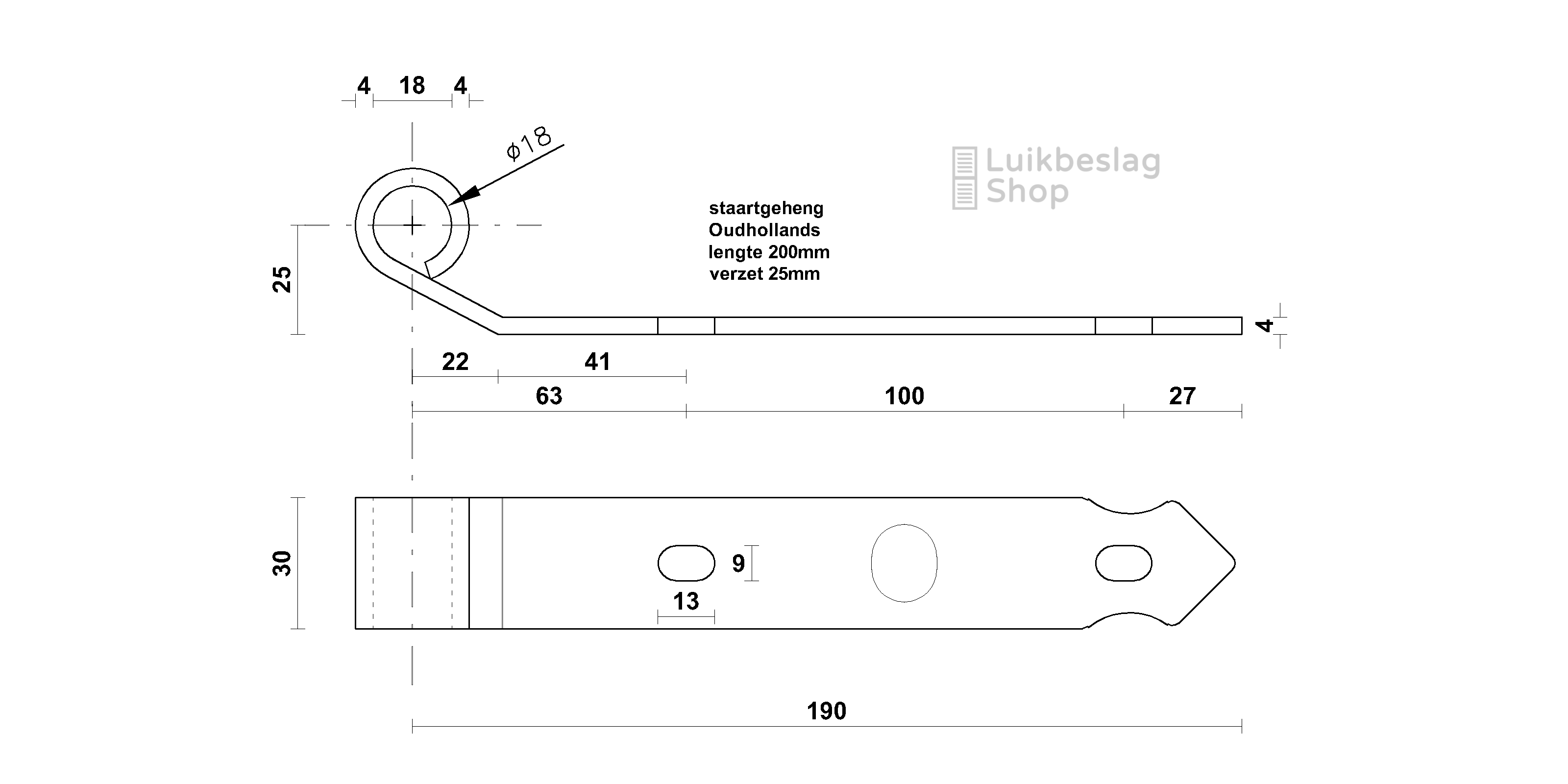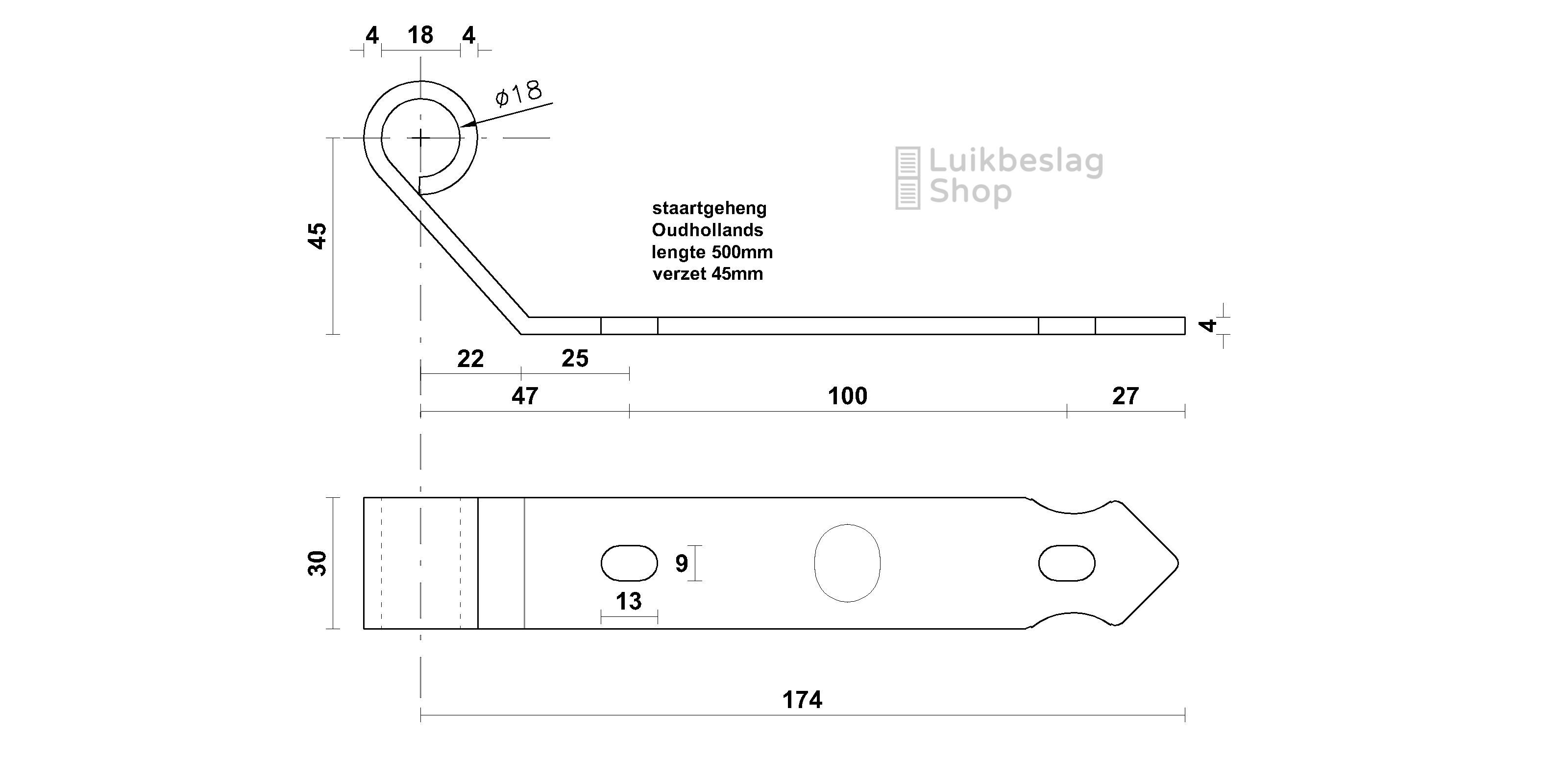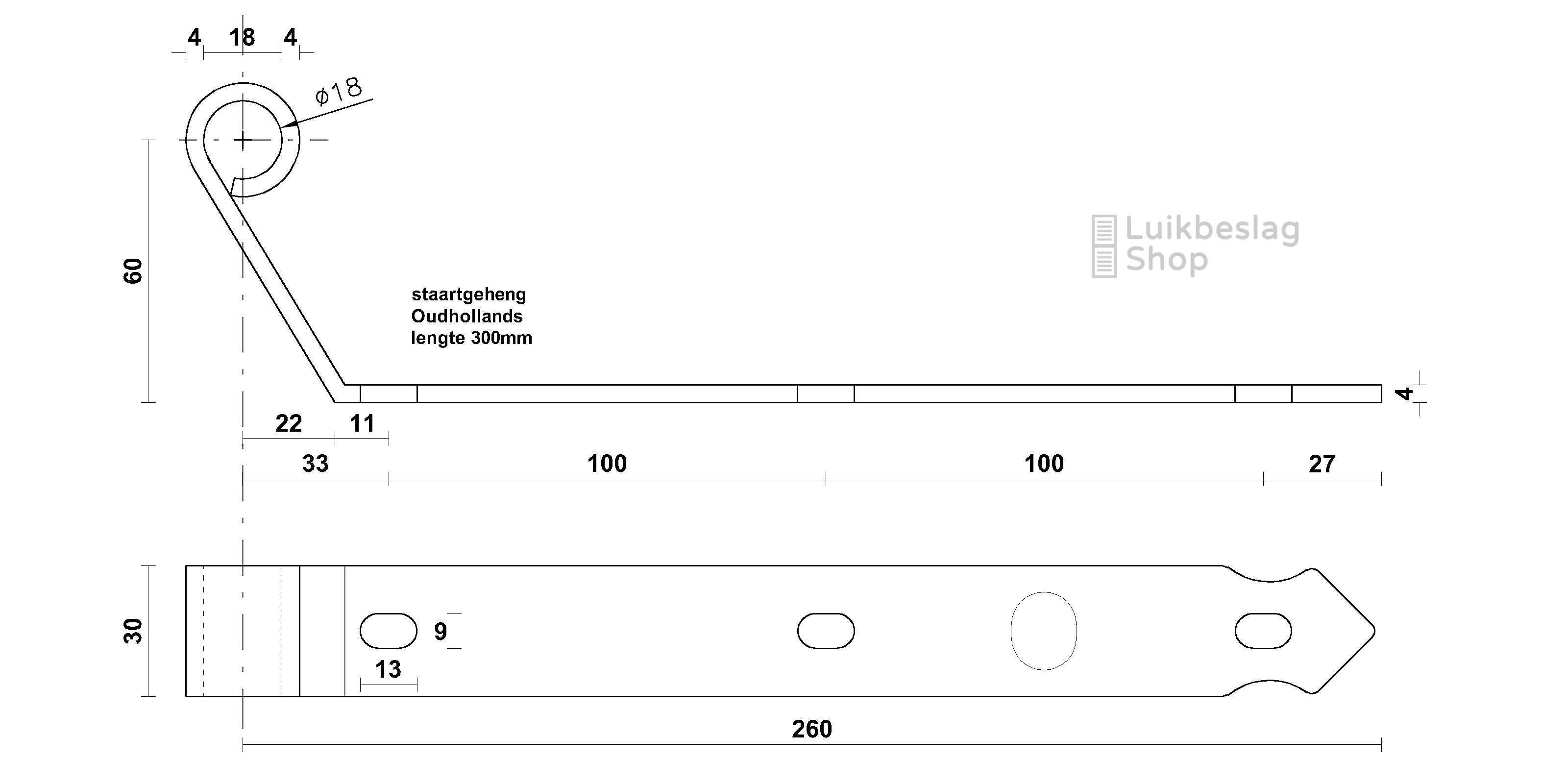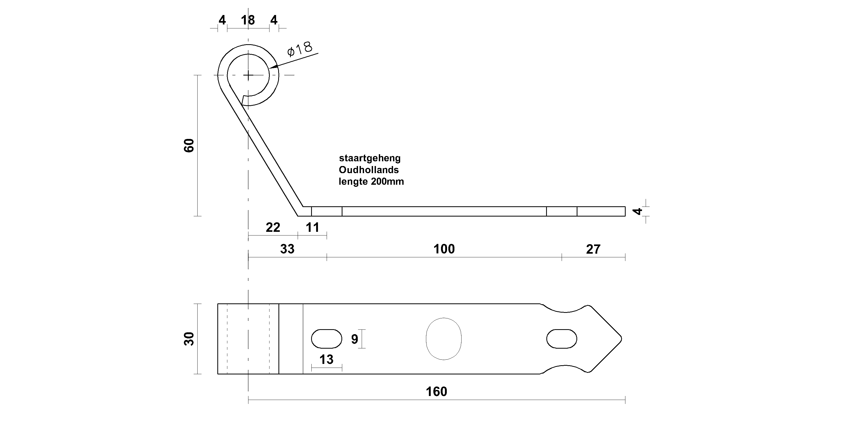 De montagegaten van deze Oudhollandse staarthengen zijn 9mm. Er kunnen M8 houtdraadbouten of slotbouten worden gebruikt om de hengen te monteren.