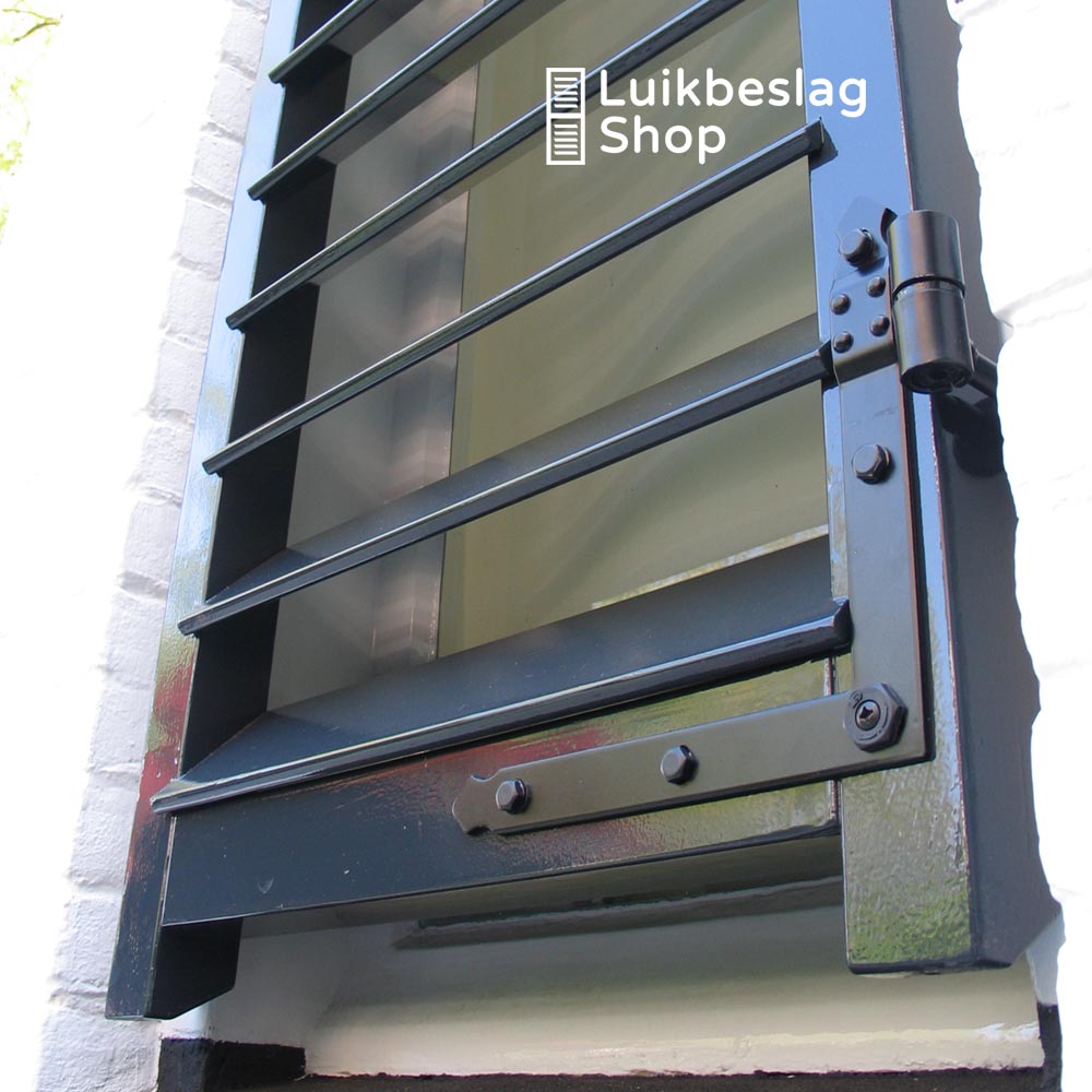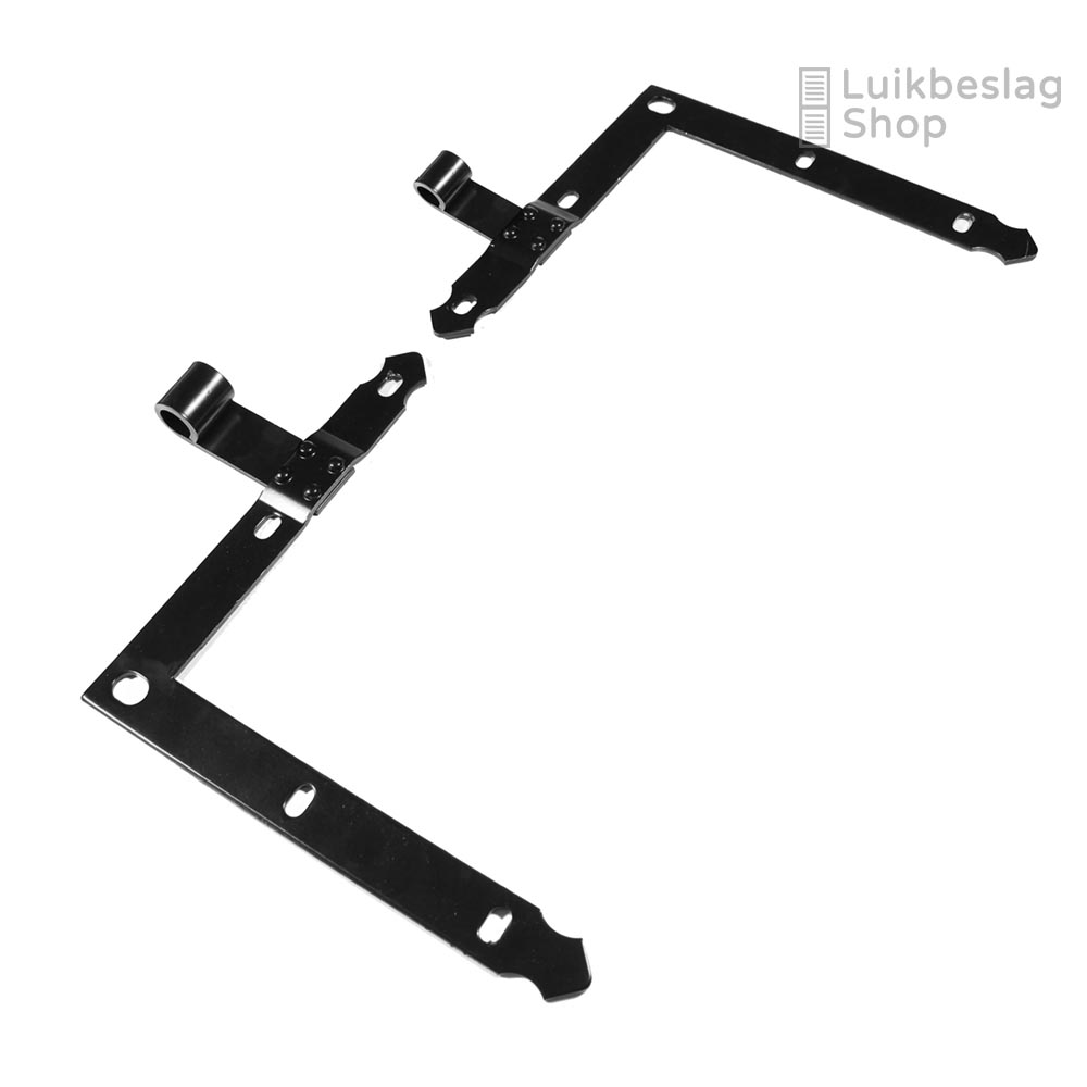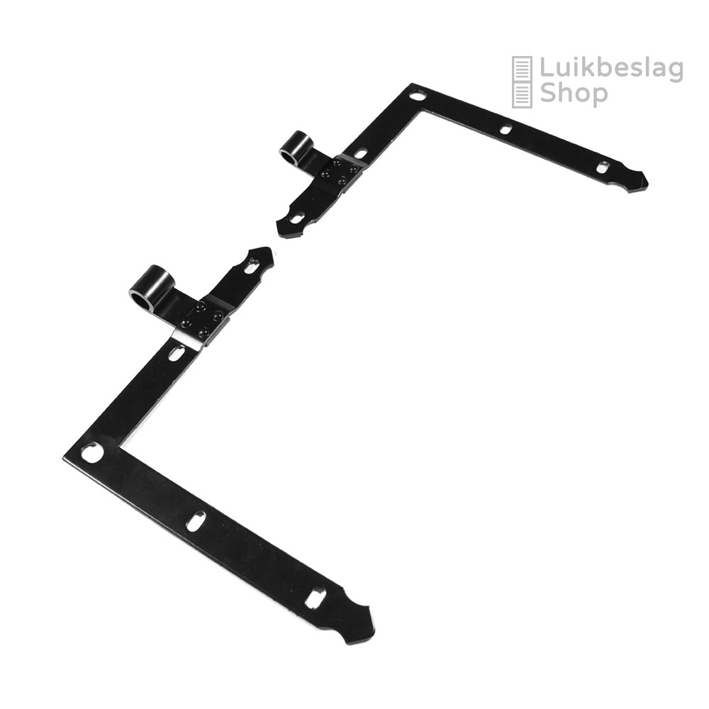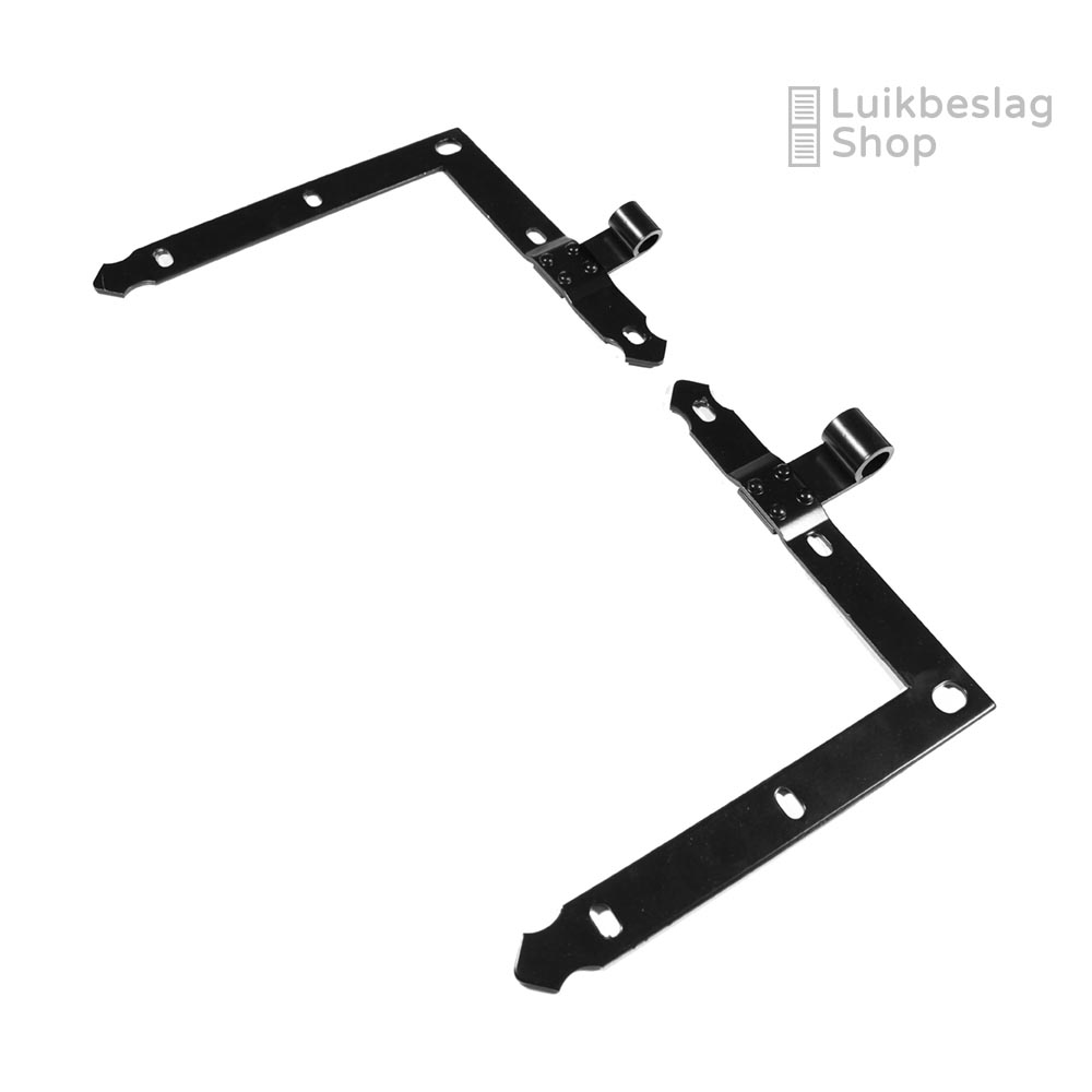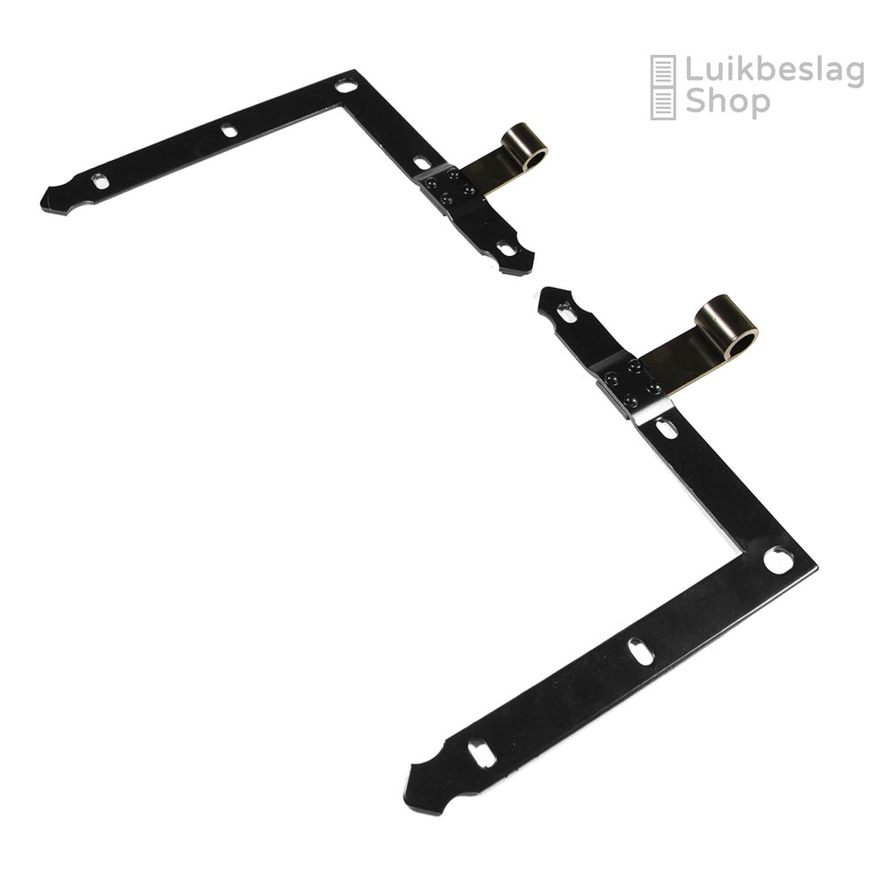 Afmetingen: 4mm dik en 30mm breed. Duimdiameter 18mm. Meer informatie: Het artikel bestaat uit 1 boven- en 1 onderheng. De montagegaten zijn 9mm. Er kunnen M8 houtdraadbouten of slotbouten worden gebruikt om de hengen te monteren. Om beschadigingen van de poedercoat te voorkomen is het aan te bevelen een kunststof beschermringetje te gebruiken onder de houtdraadbout of slotbout. De hengen zijn door de vorm van de gaten enkele millimeters verticaal te verstellen. Maatwerk: Deze gehengen kunnen wij ook in elk gewenst verzet buigen. Meer informatie over maatwerk vindt u hier. Informatiecentrum. Kijk voor meer informatie en montagemogelijkheden in het informatiecentrum hier. Draaipunttekeningen met standaard verzetten vindt u hier.