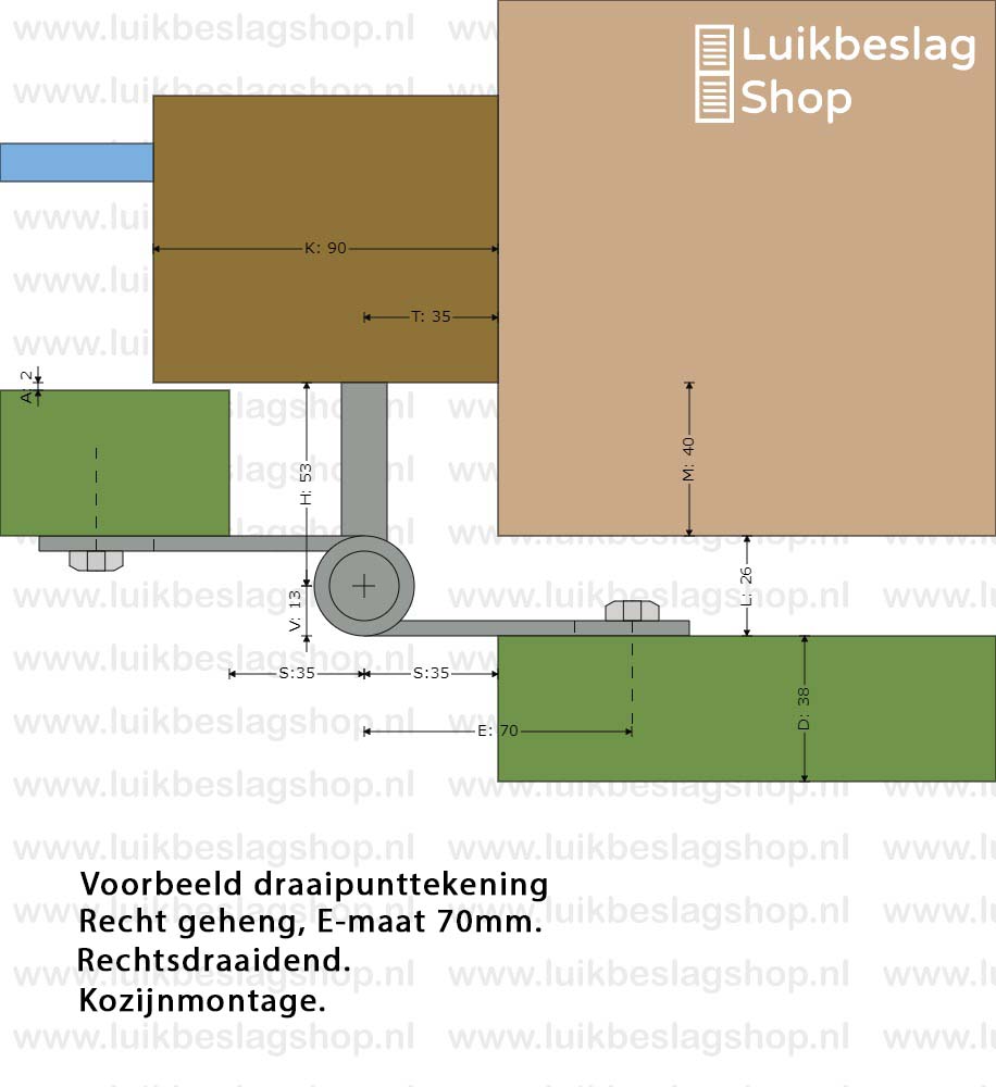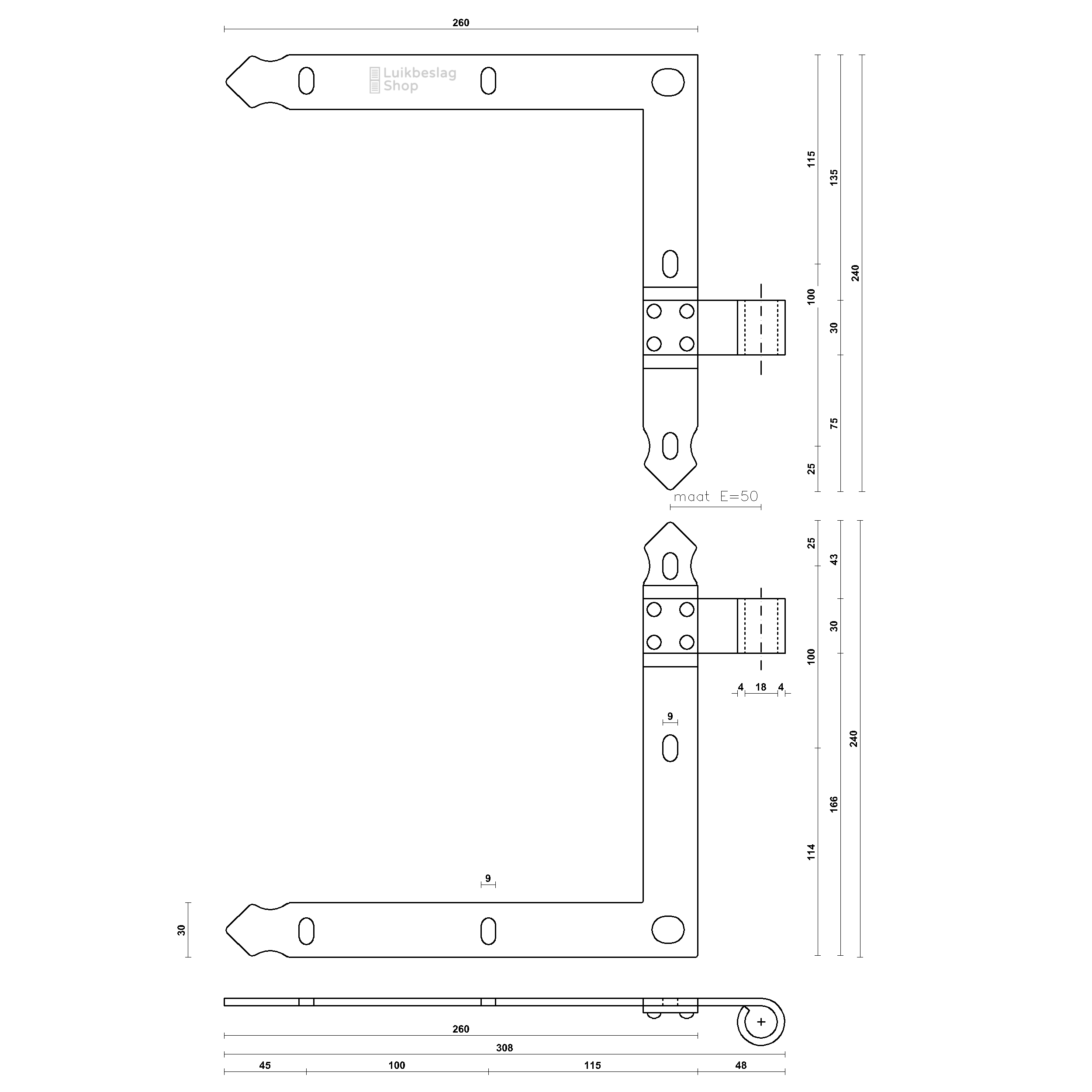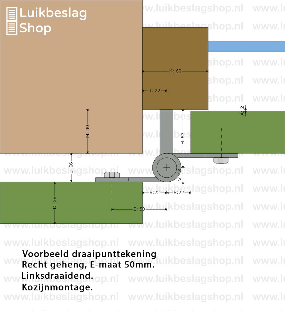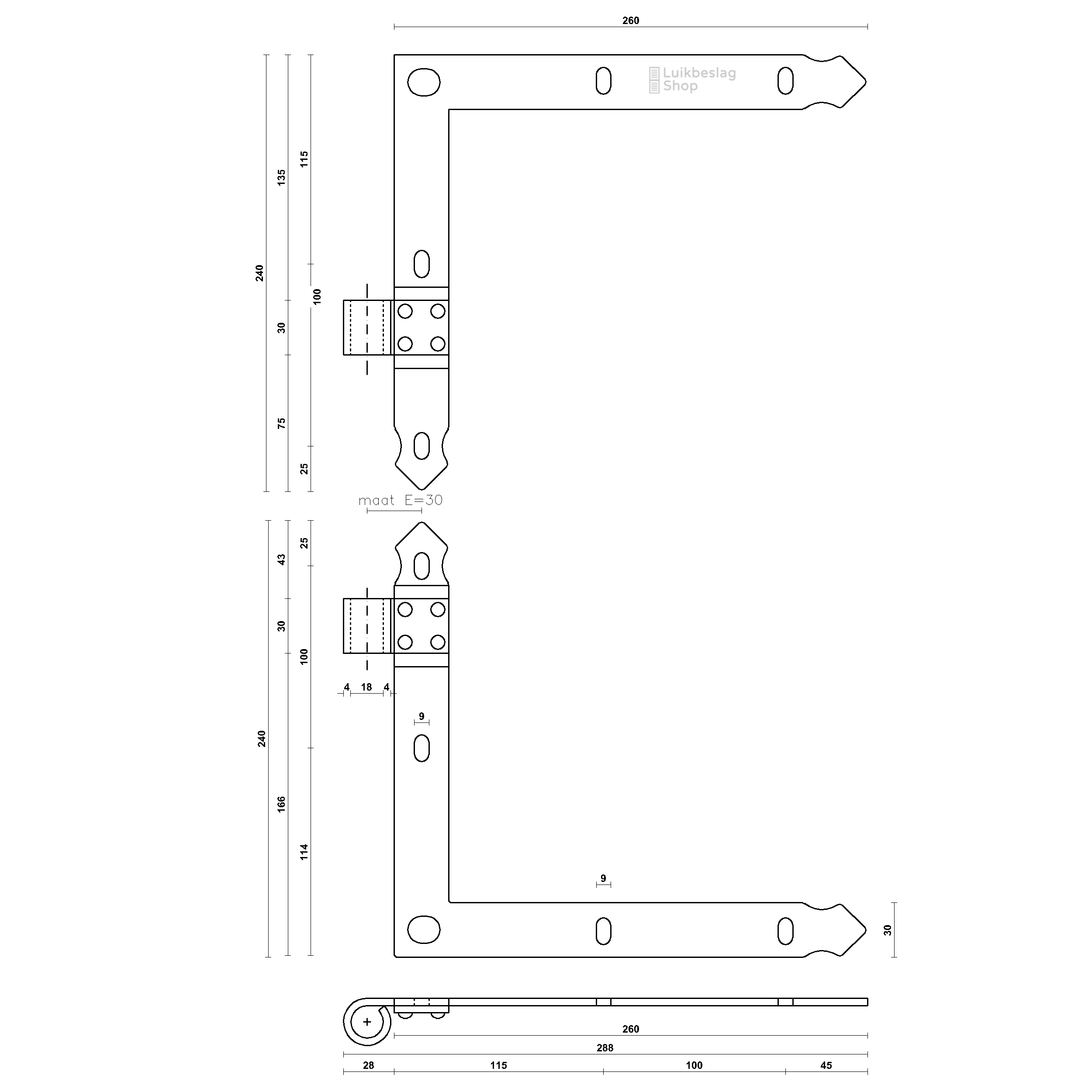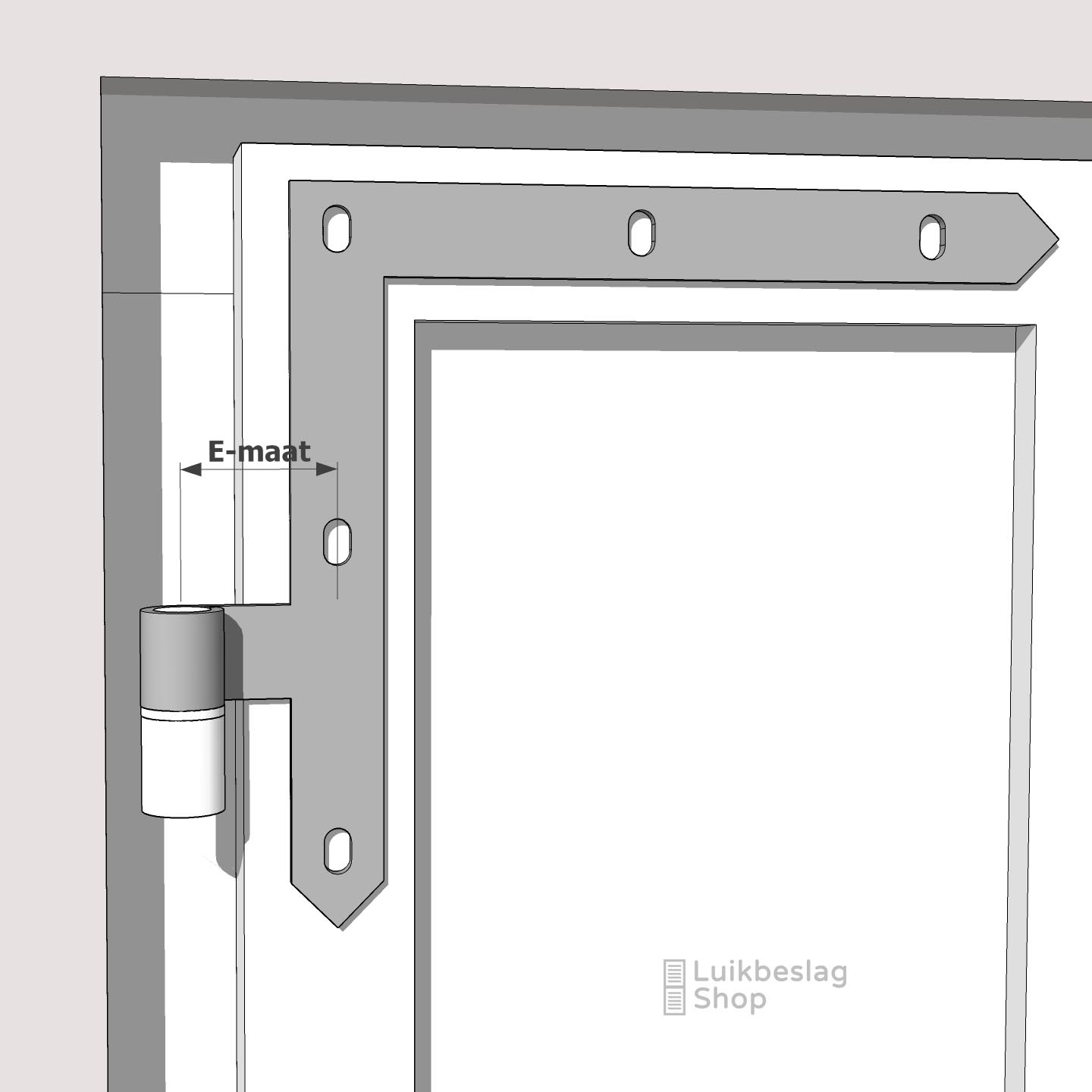 Afmetingen: 4mm dik en 30mm breed. Duimdiameter 18mm. Meer informatie: Het artikel bestaat uit 1 boven- en 1 onderheng. De montagegaten zijn 9mm. Er kunnen M8 houtdraadbouten of slotbouten worden gebruikt om de hengen te monteren. Om beschadigingen van de poedercoat te voorkomen is het aan te bevelen een kunststof beschermringetje te gebruiken onder de houtdraadbout of slotbout. De hengen zijn door de vorm van de gaten enkele millimeters verticaal te verstellen. Maatwerk: Deze gehengen kunnen wij ook in elk gewenst verzet buigen. Meer informatie over maatwerk vindt u hier. Informatiecentrum. Kijk voor meer informatie en montagemogelijkheden in het informatiecentrum hier. Draaipunttekeningen met standaard verzetten vindt u hier.