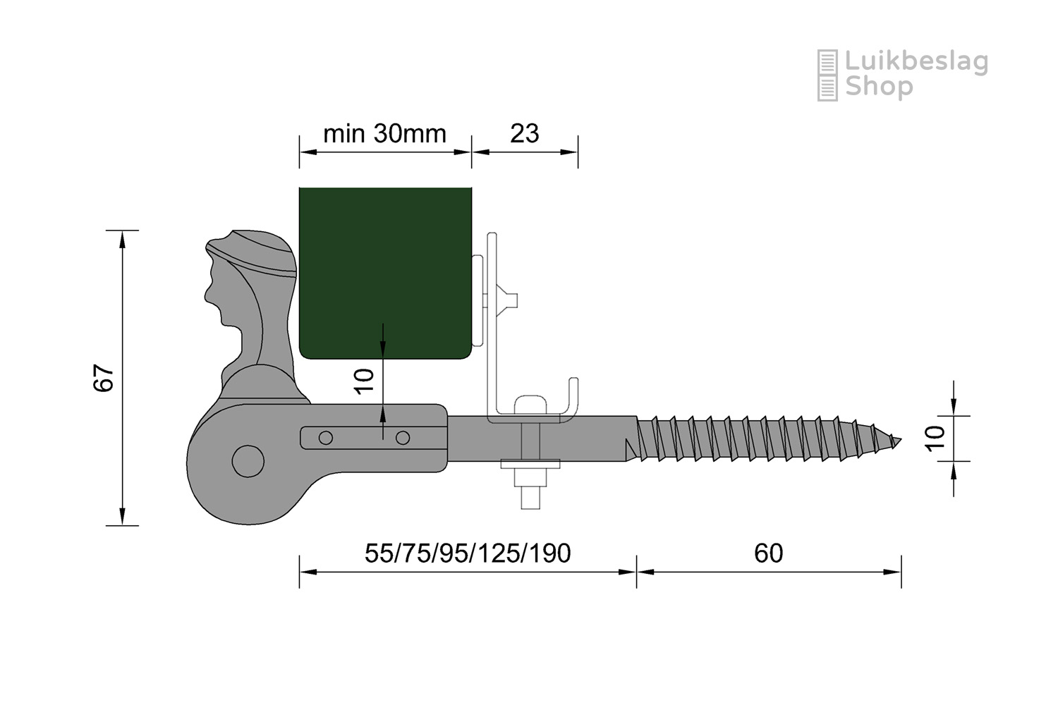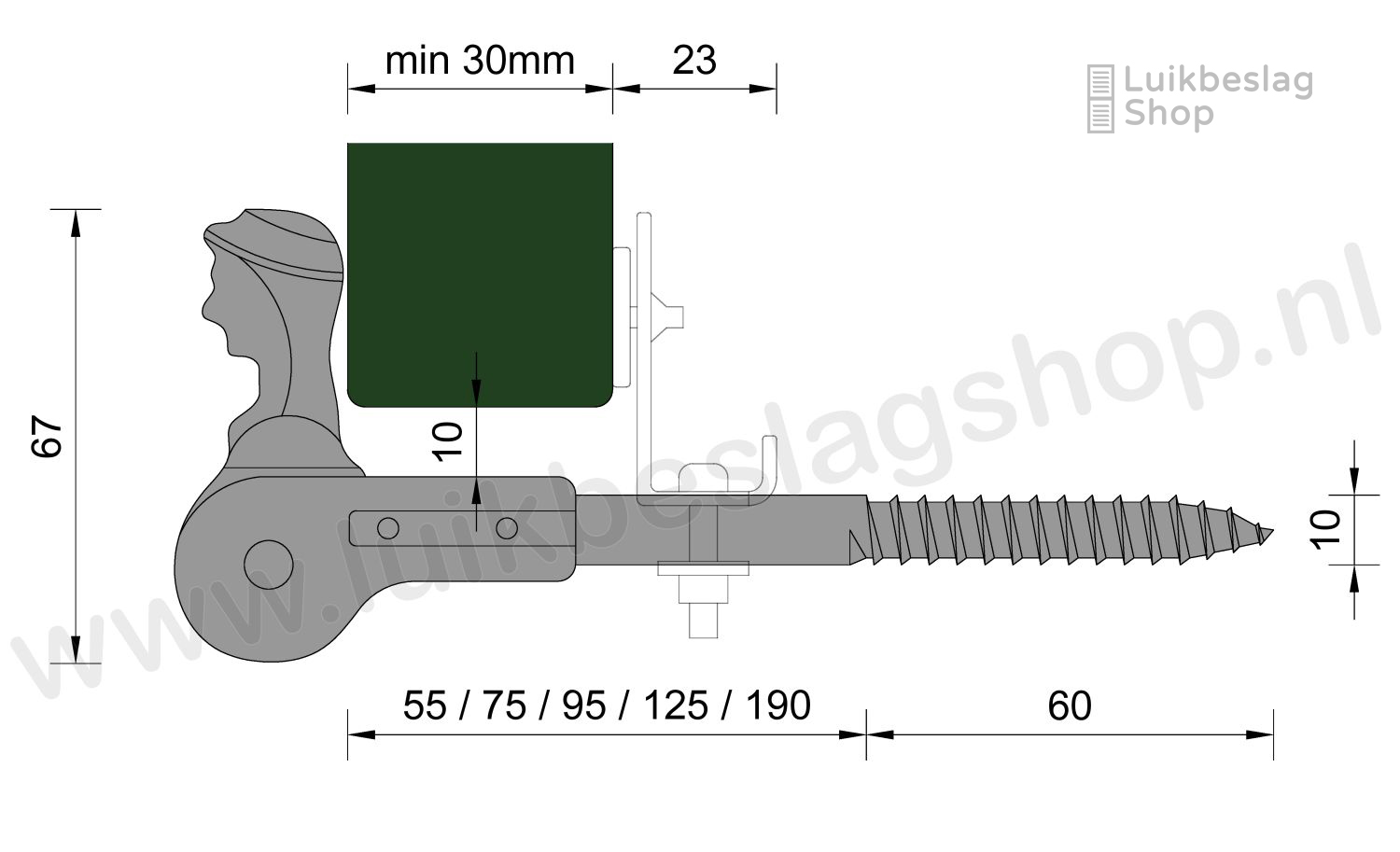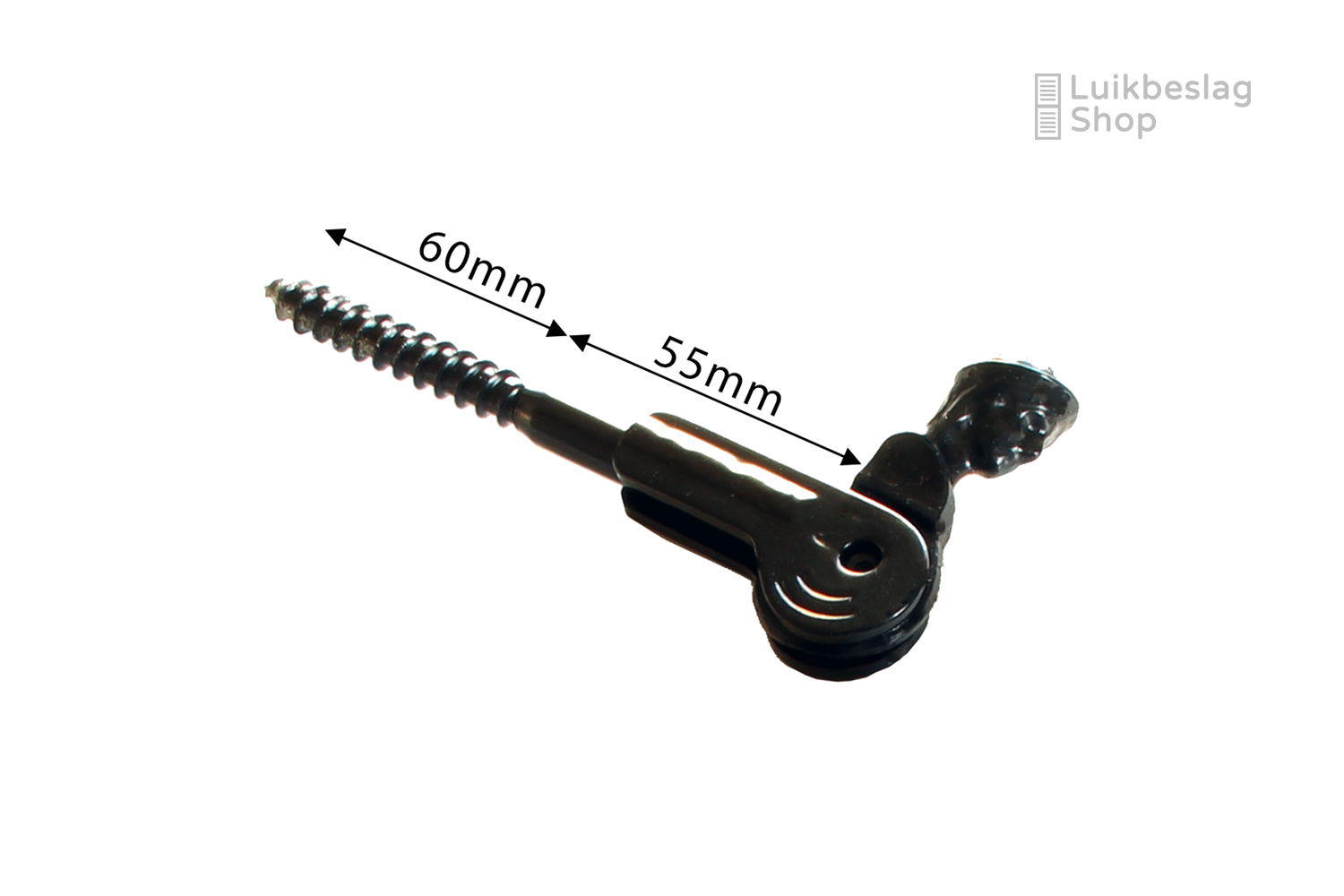Meer informatie: Deze luikvastzetter kan alleen aan de onderkant van het luik worden geplaatst. De lengte is de bruikbare lengte exclusief de schroefdraad.