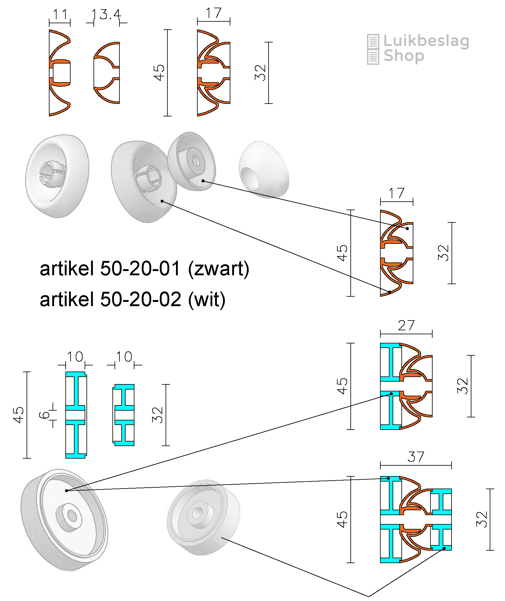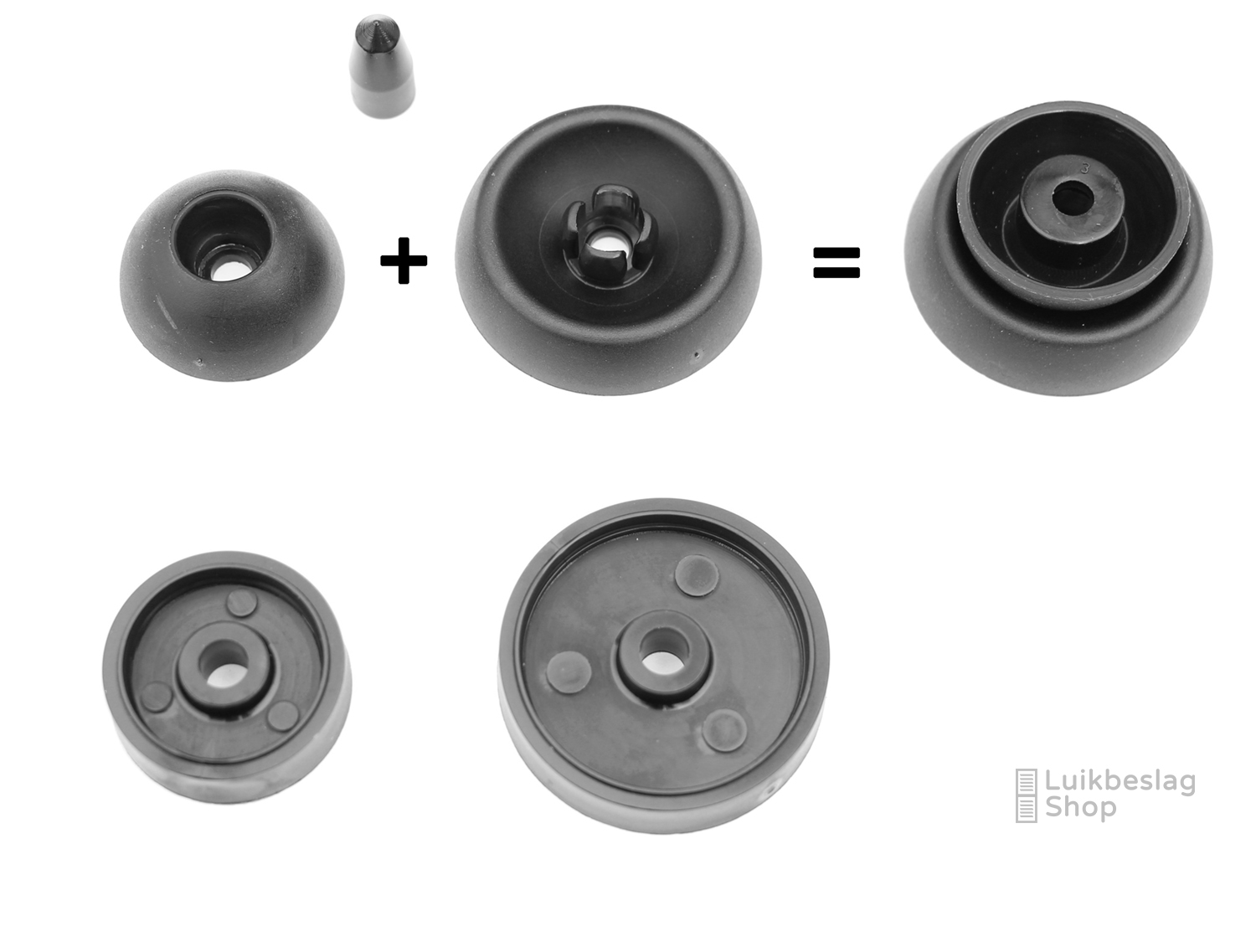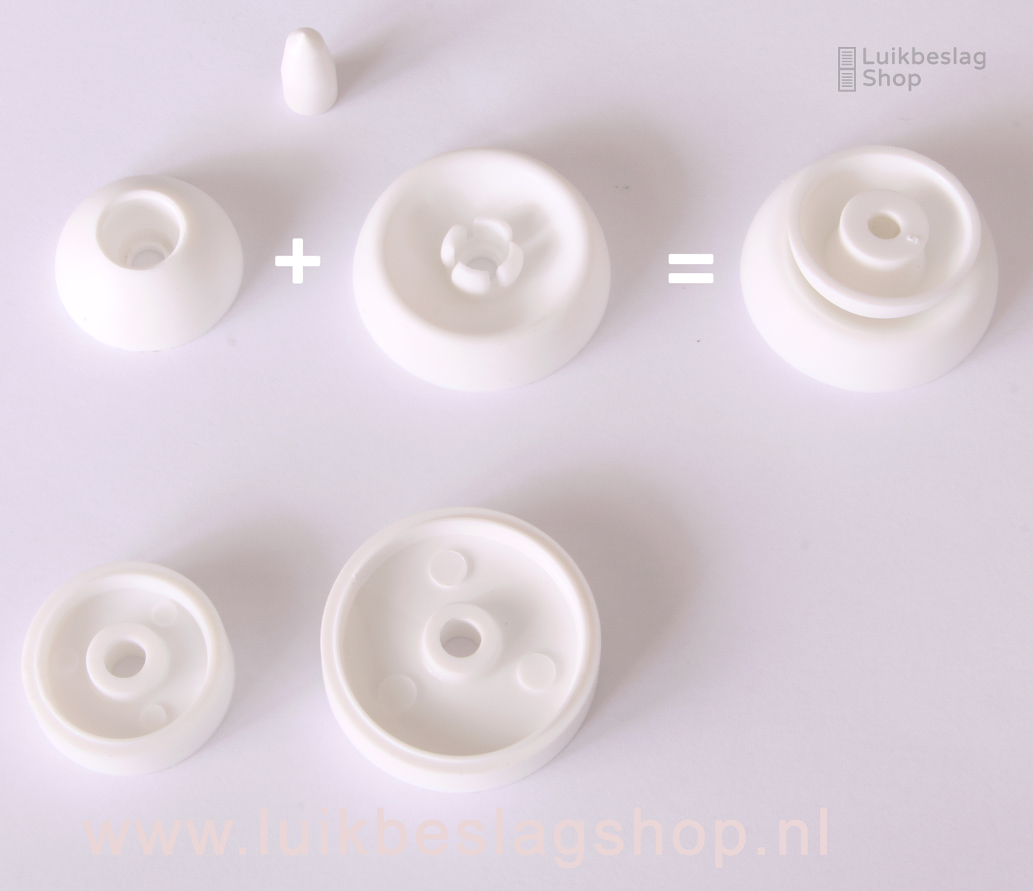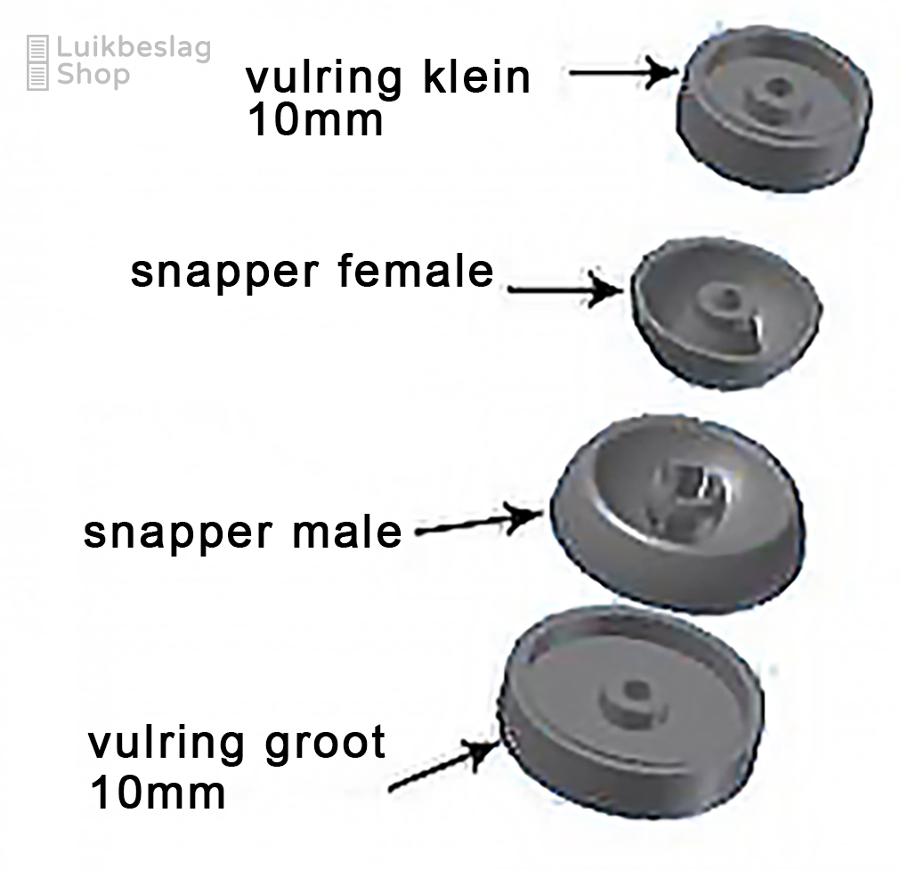 Meer informatie: Kunststof snapper met vulringen. De vulringen zijn stapelbaar. De beide delen van de snapper grijpen in elkaar zodat een redelijke klemkracht ontstaat. Te gebruiken als stopper of afstandhouder tussen 2 luiken. Ook te gebruiken voor luiken die gesloten worden en niet tegen het kozijn draaien. Voor maten zie de detailtekening. Het artikel bestaat uit snapper mannetje, snapper vrouwtje, vulring klein, vulring groot en een centerpunt. De (dikte) afstanden zijn 17, 27 en 37mm, zie bijgevoegde tekening. De snapper is inclusief een centerpunt om het positioneren van de beide delen gemakkelijk te maken. Informatiecentrum. Kijk voor meer informatie kijk in ons informatiecentrum hier.